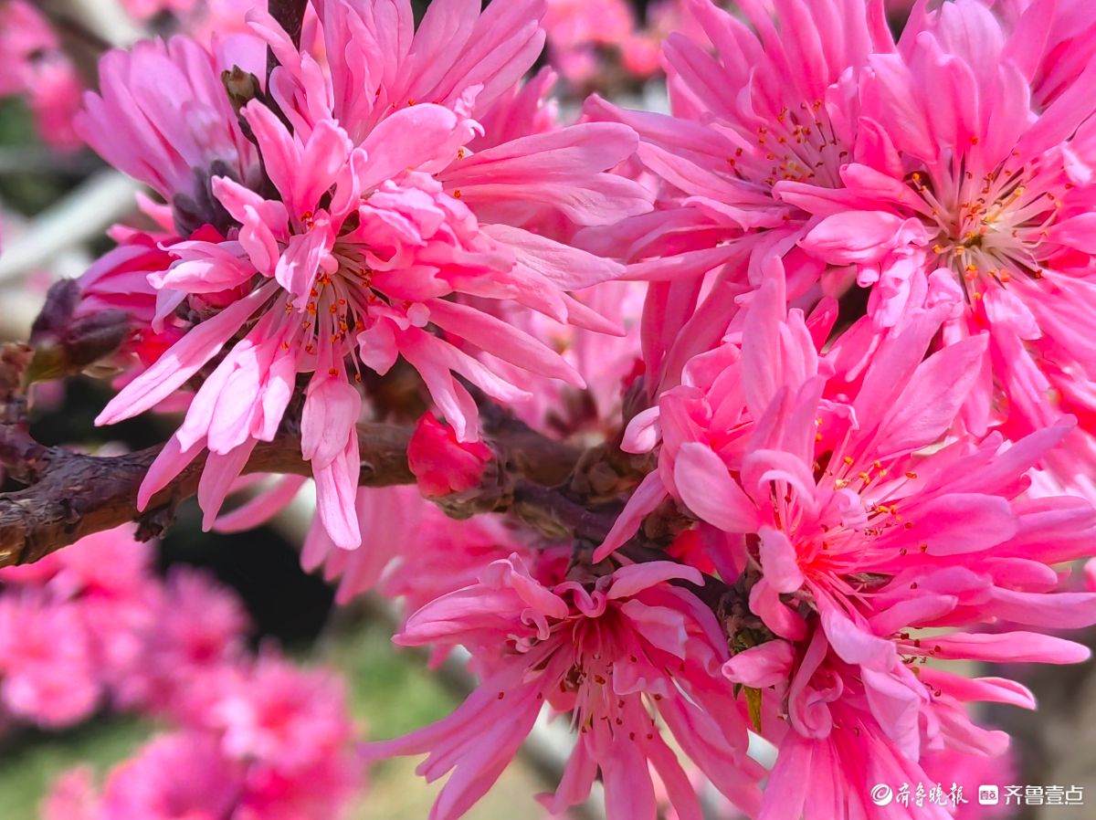"“菊花桃绽放”":点明了主景,描绘了菊花桃花开的盛况,展现了春天的生机和美丽。