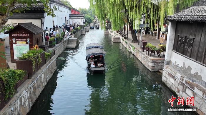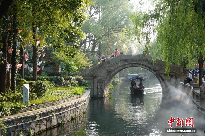 图为游人在南浔古镇内的河道边拍照留念。 刘子琳 摄