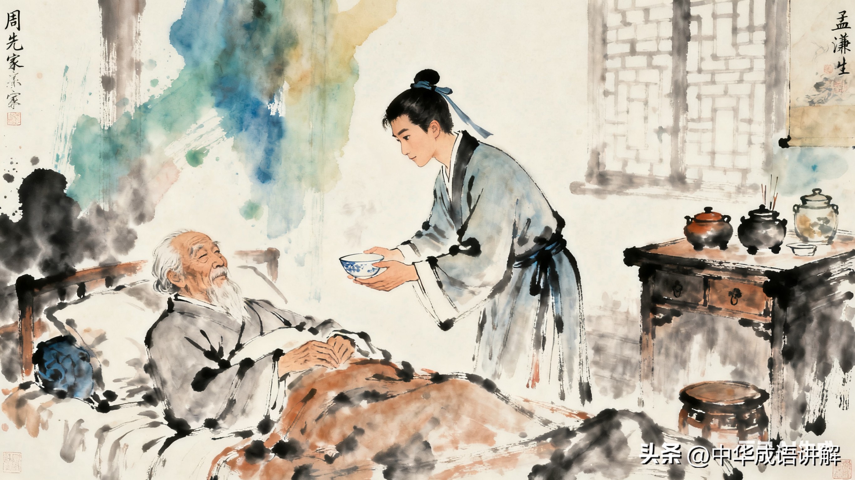 周先生病重卧床,孟谦在先生家中,正煎药奉茶,双手捧碗躬身递上