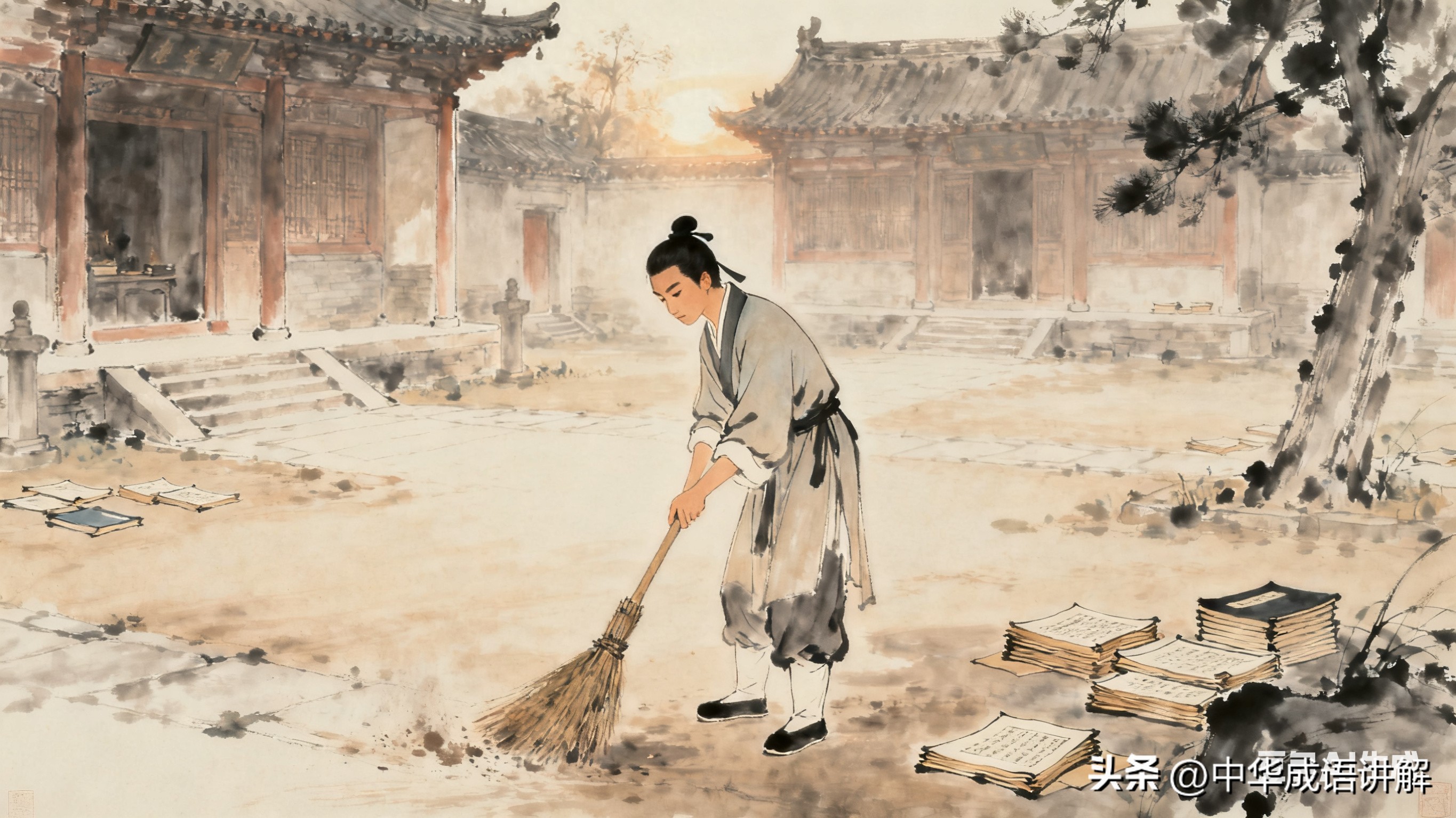 学堂内,清晨时分,孟谦正打扫庭院、整理书卷,等待周先生到来