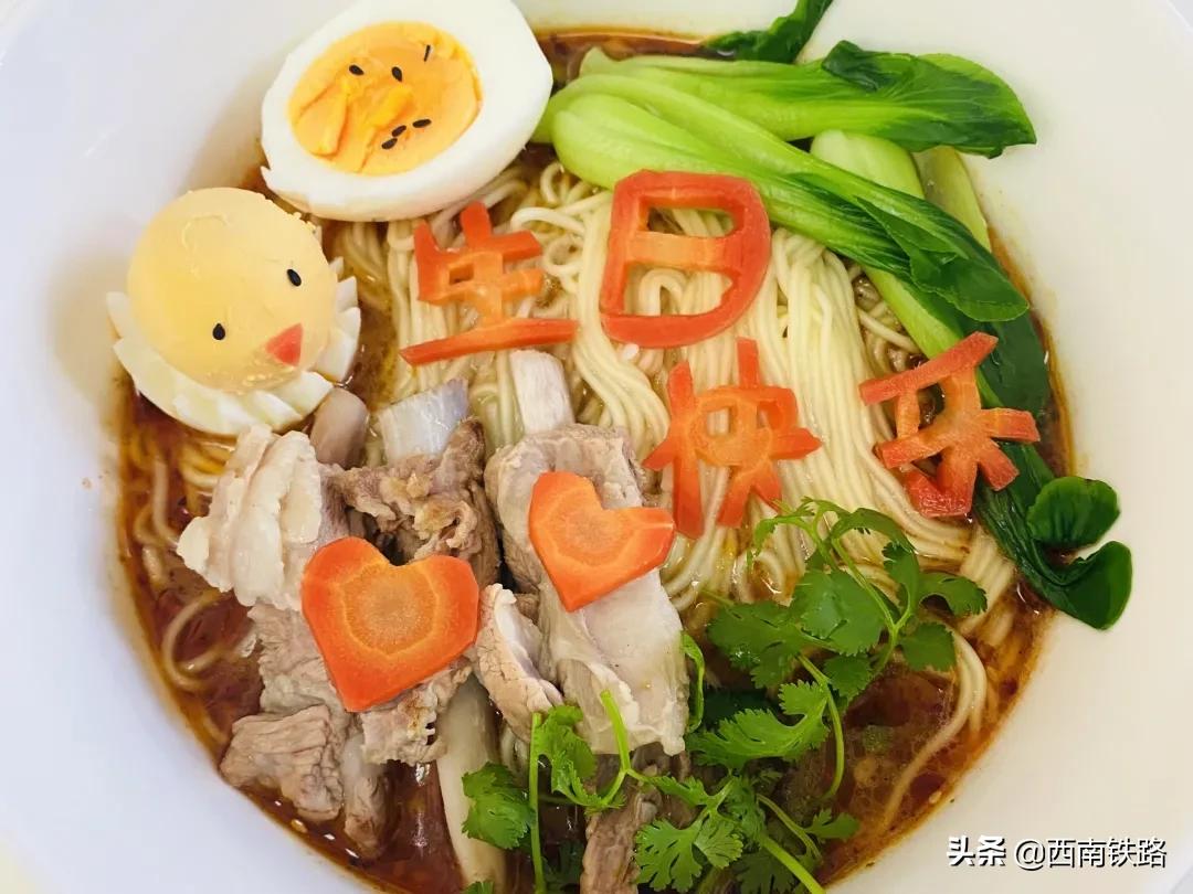 张馨尹是重庆客运段北京车队K820次5组的一名代务值班员,然而由于工作的特殊性,一年中一半的时间她都在列车上度过,而另一半的休息时间,不会有固定的节假日陪伴女儿,孩子的生日更是常常缺席,可今年却是一个例外,这天她刚好休息。厨房里洗菜,切菜,烧水煮面……按照视频中的指引步骤,张馨尹有条不紊的忙活着。当一碗五彩缤纷雕刻着生日快乐的爱心面条出现在女儿面前时,她们脸上双双露出了灿烂的笑容,有惊喜的也有满足的。