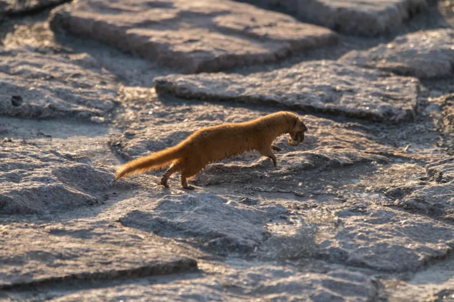 黄鼠狼叼着一只螃蟹。 图片来源:上海市绿化市容局