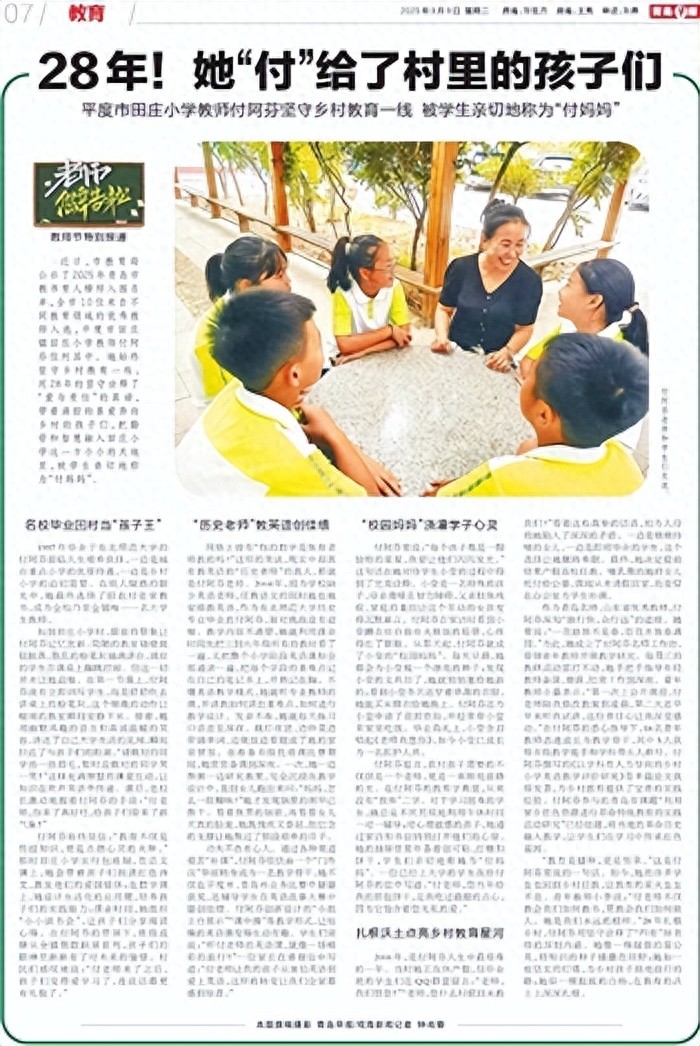 付阿芬始终坚信:“教育不仅是传授知识,更是点燃心灵的火种。”那时田庄小学实行包班制,在语文课上,她会带着孩子们朗读红色诗文,激发他们的爱国情怀;在数学课上,她设计生活化的应用题,培养孩子们的实践能力;课余时间,她组织“小小读书会”,让孩子们分享阅读心得。在付阿芬的带领下,班级成绩从全镇倒数跃居前列,孩子们的眼神里渐渐有了对未来的憧憬。村民们感叹地说:“付老师来了之后,孩子们变得爱学习了,连说话都更有礼貌了。”