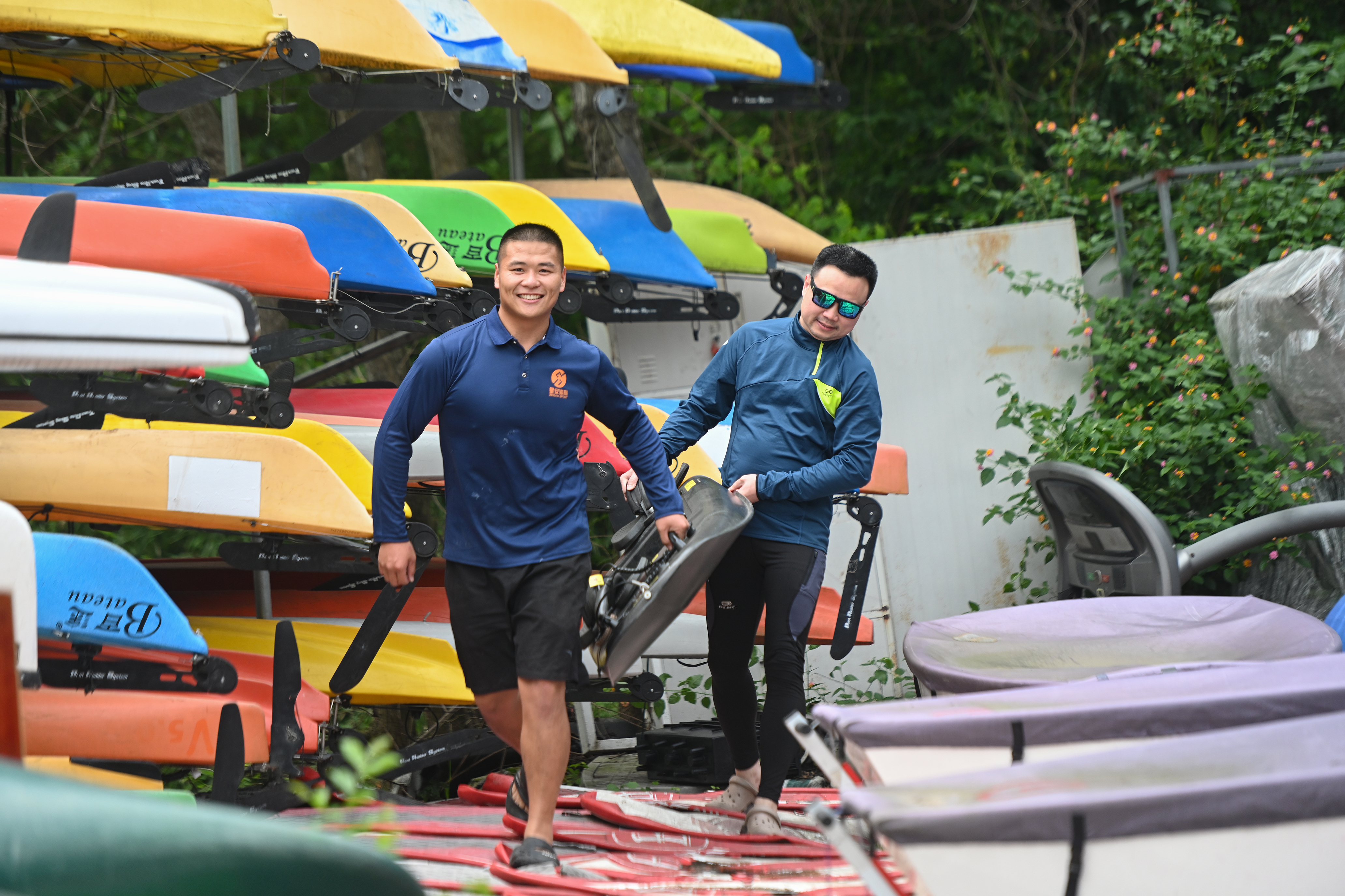 4月27日,水上运动爱好者在星安绿舟营地搬出动力冲浪板。 新华社记者周义摄