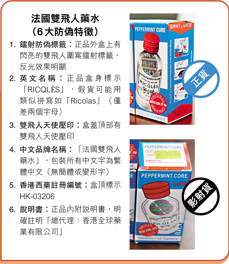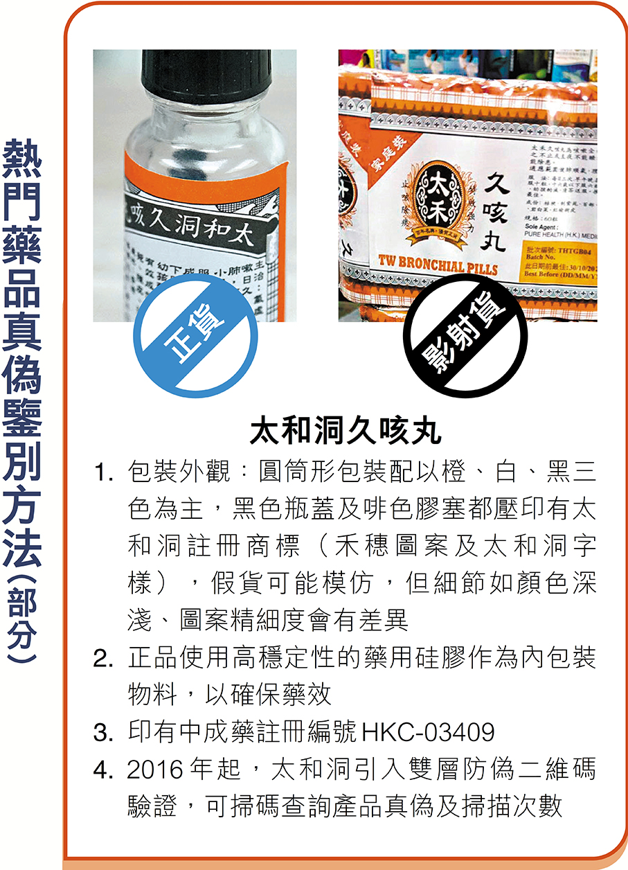 香港文汇报讯(记者 广济、曾立本)影射药无品质保障,消费者误购轻则未收预期药效,重则影响健康,往往背锅的是正货药厂及代理商。多间深受影射药祸延的药厂及代理商日前接受香港文汇报访问,其中生产“太和洞久咳丸”的药厂及“法国双飞人药水”代理商更曾诉诸法律,但维权路上充满障碍,而太和洞多年来面对市面上层出不穷的多款影射药,也只成功维权一次,最后惨胜,是香港罕见成功据理力争的维护商标权的个案,成为香港药业维权的写照。业界希望,商标改革加快步伐。