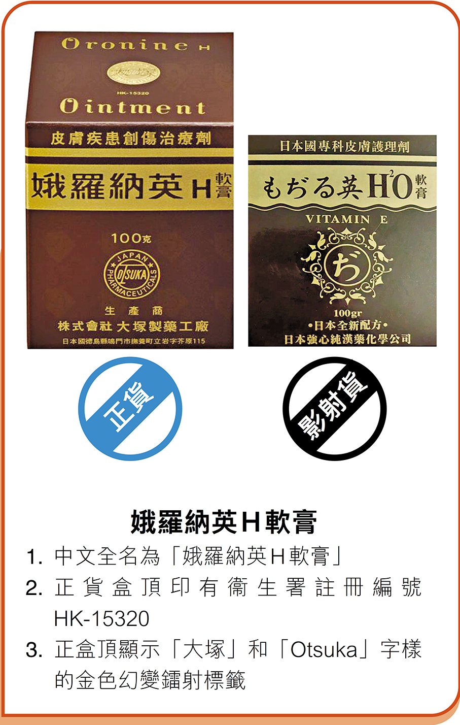 香港大冢制药有限公司董事总经理周桂芳表示,影射药可能对消费者安全构成风险,并以一款名为“娥のタイエリー H 软膏”的疑似“娥罗纳英 H 软膏”影射货为例,指出其包装、颜色等设计与正货极为相似,仅在名称上使用大量日文以作区分。然而,成分方面,正货明确标示唯一活性成分为Chlorhexidine Gluconate Solution(洗必泰葡萄糖酸脂溶液),具治疗创伤皮肤功效,并注明适应症包括粉刺、疹子、轻度火伤、皮肤破裂、冻疮、轻度刀伤、干性香港脚及癣,强调为“创伤治疗剂”,可预防伤口细菌感染。