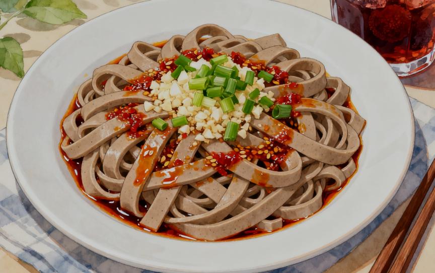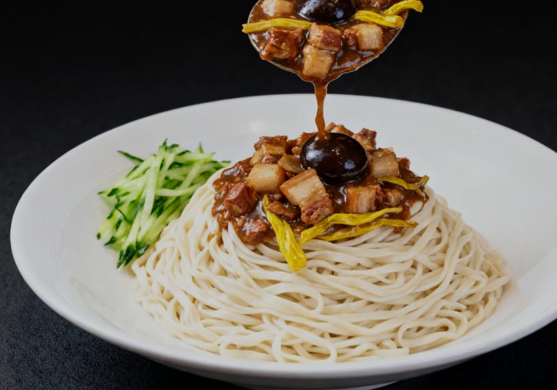 - 摆盘讲究:面条堆成小山,浇上卤汁,配黄瓜丝解腻