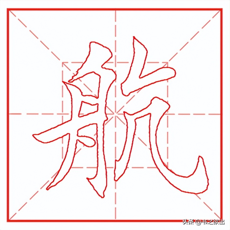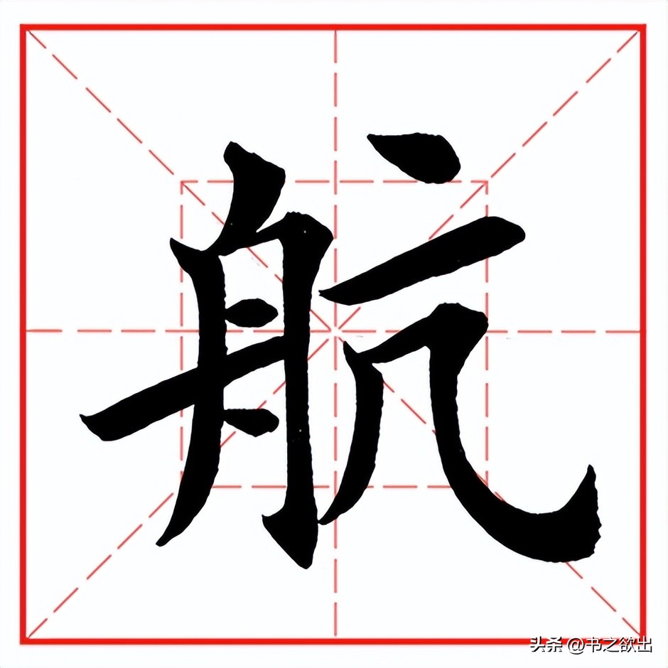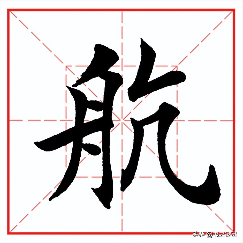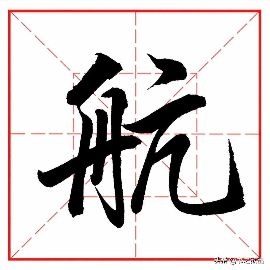 左边“舟”字形体瘦高,首撇稍重,角度略平,短促有力;竖撇起笔挡住首撇的收笔,撇身勿重,先竖后撇,出锋力达撇尖;横折竖钩横画一带而过,随即折笔向下内擫写竖,竖身稍细,内直外弯,与竖撇呈相背之势,行笔到位后跪笔弹锋出钩,钩身勿大,钩角稍低于竖撇撇尖;里面两个点笔不要写大,布白均匀,形态各异;横画起笔左探,抗肩角度稍大,从两点之间穿过,收笔藏于右竖。