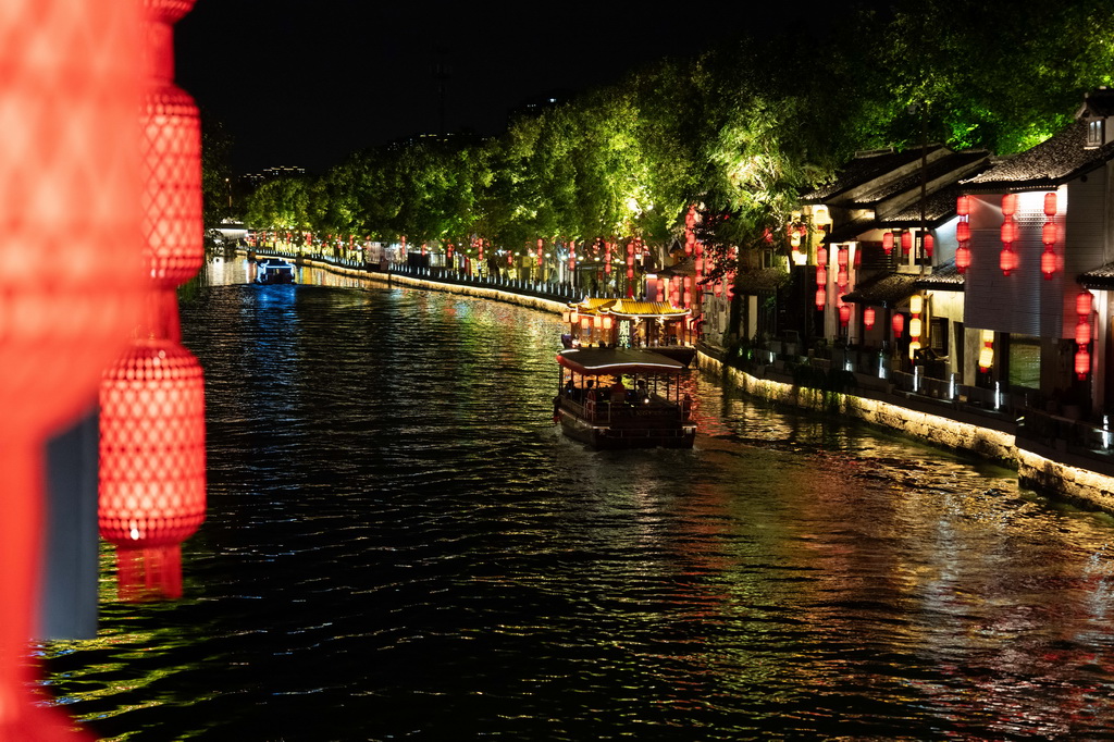 9月23日,游船行驶在无锡市古运河上。 清名桥历史文化街区位于江苏省无锡市,街区内文物遗址品类丰富,被誉为“江南水弄堂、运河绝版地”。近年来,无锡市围绕清名桥历史文化街区,以古运河为天然布景,以水为幕、以桥为景,通过水幕光影舞台、全息投影和环绕立体声技术等,展现丰富的人文景观,吸引游客夜游古运河。新华社记者 胡智轩 摄