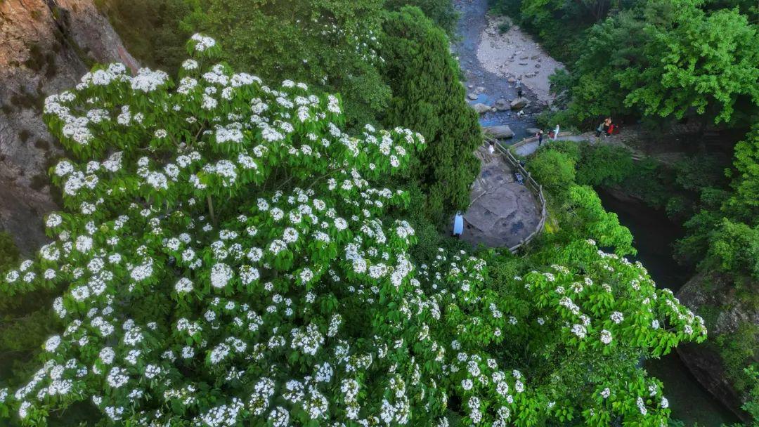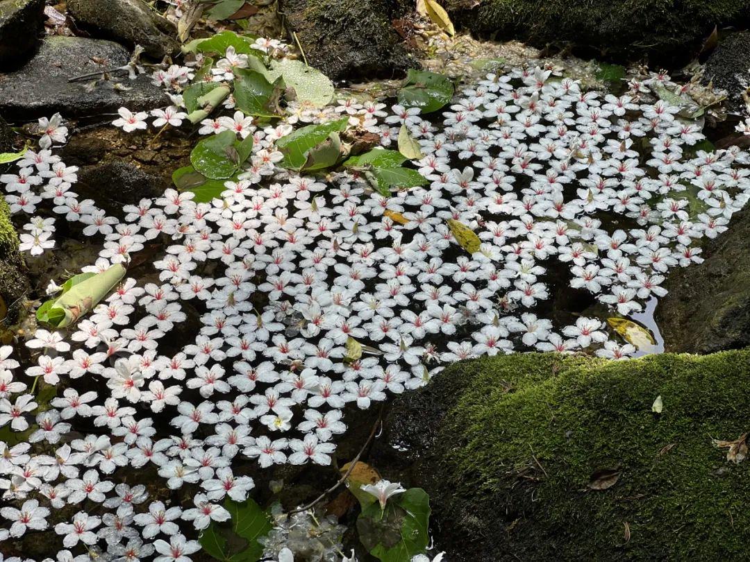 这场“五月雪”不似冬日的凛冽,却比春樱更磅礴——风吹过处,花瓣纷扬如碎玉倾洒,石阶、溪流、古刹檐角皆染素色,天地间只余簌簌落花声应和着山涧清泉,奏响初夏的序曲。