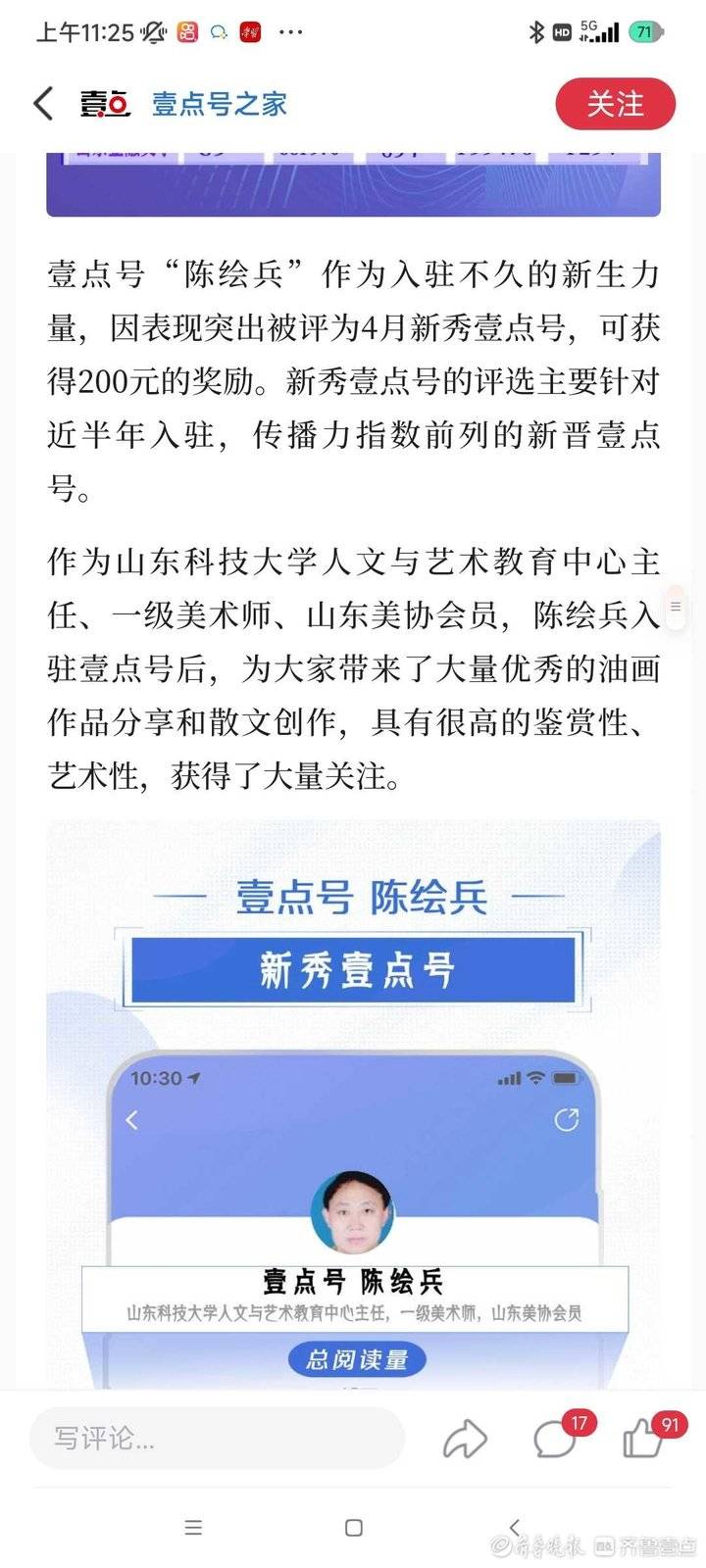 在秋枫(闫洪凤)老师的影响和热心帮助下,申请了壹点号,原本是想拓展自己所从事的高校美育工作的辐射力和影响空间,促进工作不断提升和高质量发展,却不曾想得到了大家如此温暖的鼓励与厚爱。只想拥有一个鸟语花香的田园,却收获了一个万紫千红的春天。我是如此平凡却又如此幸运,我要真心的说一声:谢谢你,闫老师!谢谢你,齐鲁壹点!