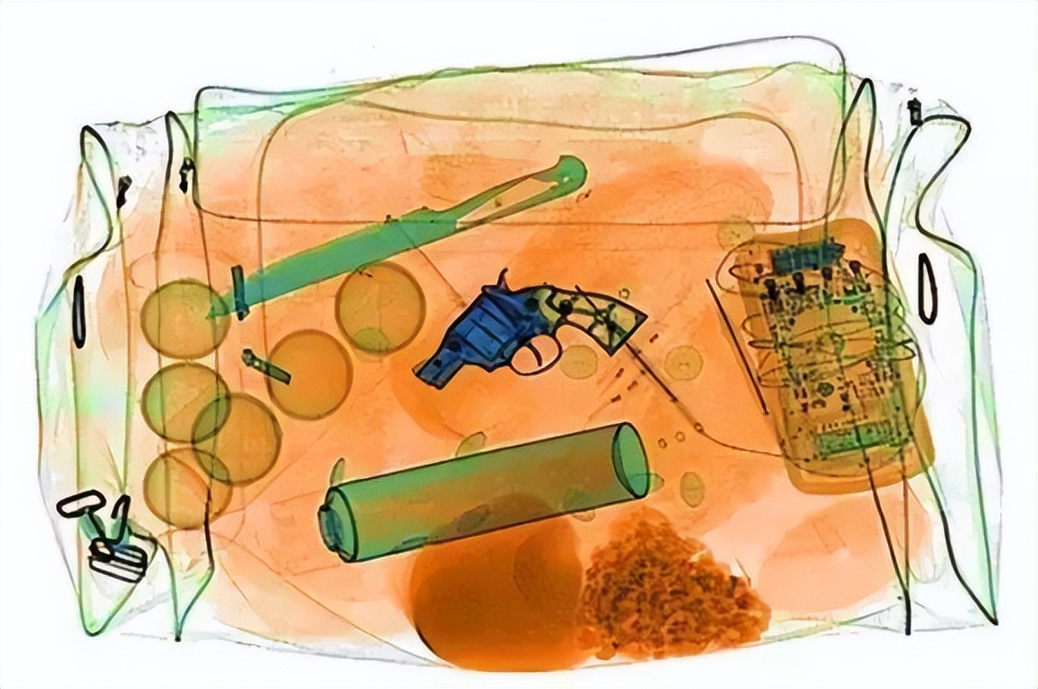 比如常见的双能X 射线安检仪,它不光能够测量出物体的形状,还能够粗略判断物体的类型,比如有机物会呈现出橘黄色,混合物和轻金属(盐类)会呈现绿色,无机物呈现蓝色。