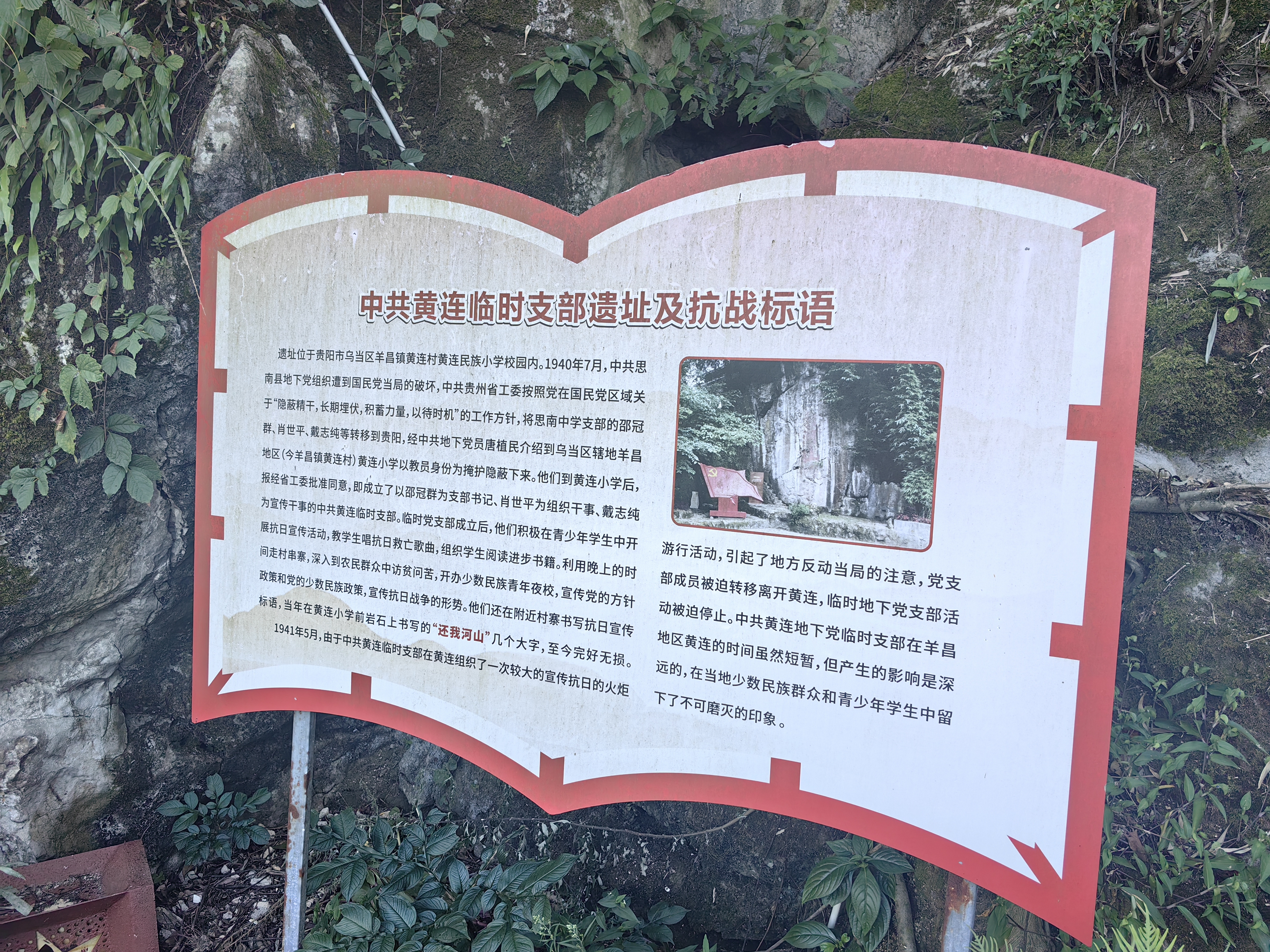 时光倒流到1940年7月,中共思南县地下党组织遭到国民党当局破坏,中共贵州省工委按照党在国民党区域关于“隐蔽精干,长期埋伏,积蓄力量,以待时机”的工作方针,将思南中学支部的邵冠群、肖世平、戴志纯等转移到贵阳,经中共地下党员唐植民介绍到乌当区羊昌镇黄连村黄连小学以教员身份为掩护隐蔽下来。他们在这里成立临时党支部,积极开展抗日宣传活动,组织学生唱抗日救亡歌曲、读进步书籍,在当地群众中宣传党的方针、政策和抗日战争形势等,并在黄连小学后门旁的石壁上写下了“还我河山”四个大字,向当地群众全面宣传抗日。2019年,“还我河山”抗战标语被正式列为贵阳市文物保护单位。