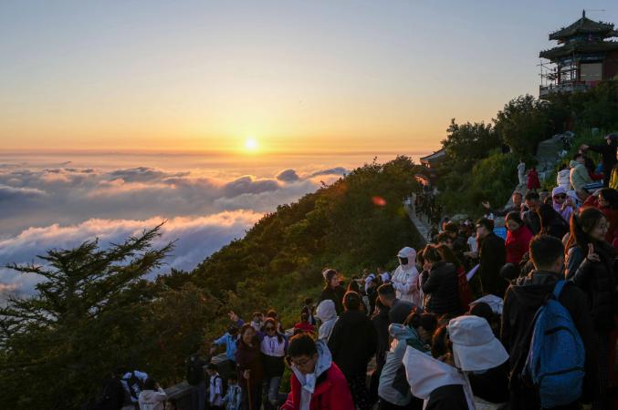 五点,日观台上已经挤满了观看日出的游客,许多游客通宵爬山,就是为了亲眼目睹这一刻日出云海的壮观。五点零五,人群中突然传来一阵尖叫,太阳出来了!我顺着人们目光聚焦的方向远望,果然看到在苍茫的云海上出现了红彤彤的小圆点,此刻只有太阳顶部的很小一部分。周围的云层被太阳染成粉红、橘黄、橙红、粉黛等不同的颜色,层次极为丰富。太阳几乎是蹦着从云海中出来的,它似乎迫不及待地摆脱云海的束缚,迎来崭新的一天。很快,太阳的全部身姿出现在人们眼前,天空也被它染得金红。云海翻涌,像极了奔腾的波涛。观景台上有人举着硕大的红旗,近处的红旗和远处的红日遥相呼应,甚为壮观。
