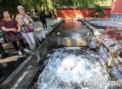 注: 墨泉为一钻孔喷泉,1966年建于百脉泉公园内龙泉寺西南角,孔口直径0.4米,泉口因铸铁管黑色,水清透明,望去泉水黝深,故名墨泉。