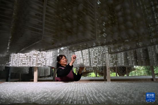 5月16日,在四川省内江市东兴区双桥镇双流村,蚕农在蚕房里查看蚕的上蔟吐丝结茧情况。