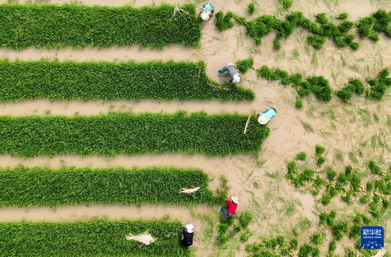 5月20日,在湖南省衡阳市衡阳县台源镇,村民在稻田插秧(无人机照片)。