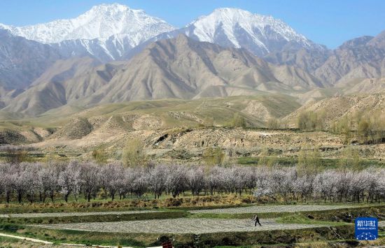5月5日,在甘肃省张掖市高台县新坝镇,山下杏花盛开,村民在田间劳作。