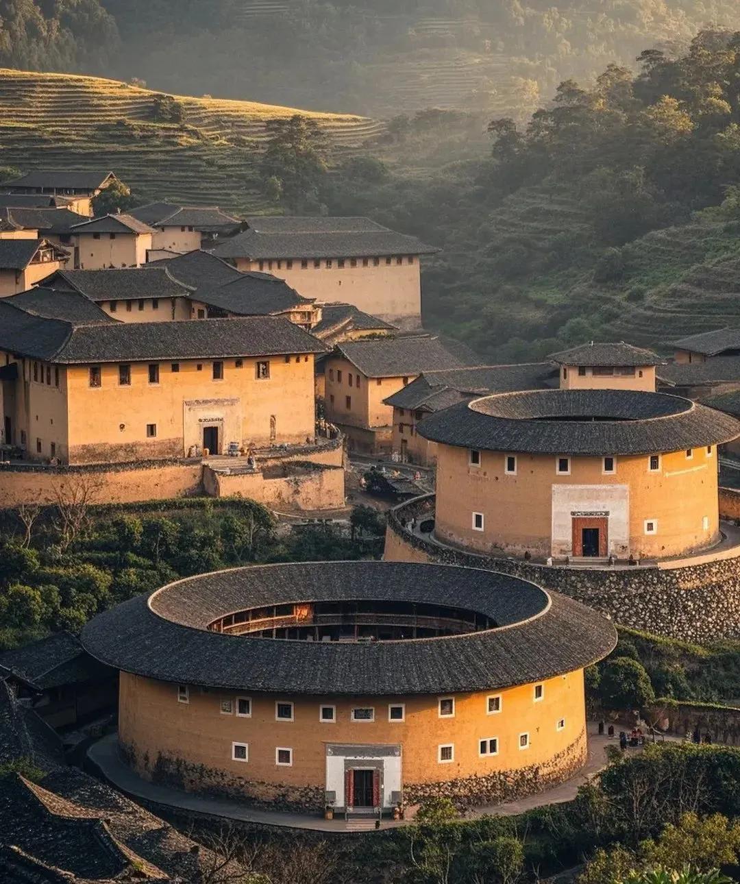 当第一缕晨光洒在直径73米的承启楼上,“四圆四环”的土黄色巨堡如同飞碟降落山间。
