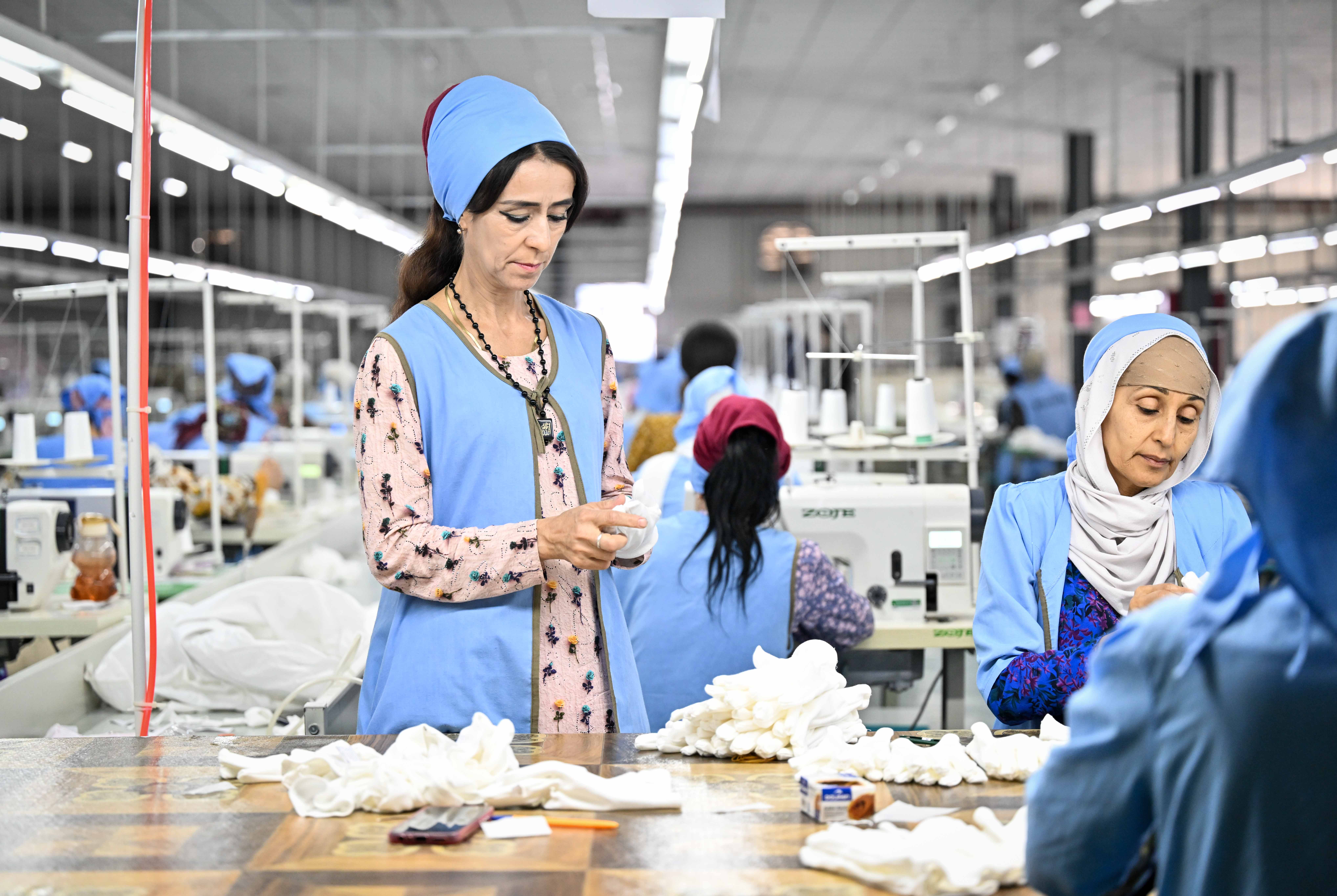 9月12日,在塔吉克斯坦哈特隆州丹加拉区,工人在中塔合作项目丹加拉农业纺织产业园成衣车间工作。新华社记者 李任滋 摄