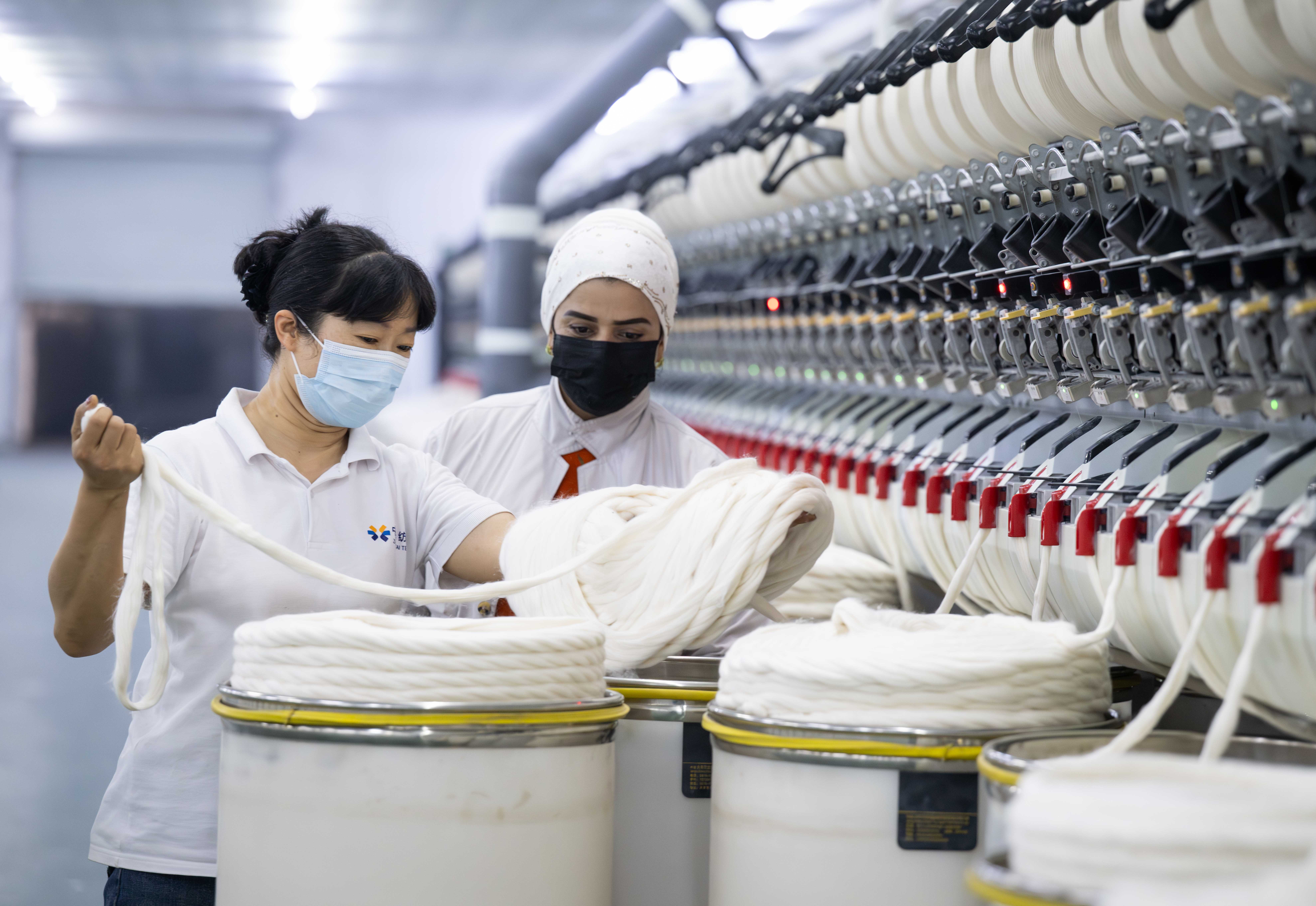 9月12日,在塔吉克斯坦哈特隆州丹加拉区的中塔合作项目丹加拉农业纺织产业园,纺纱车间主任指导一名工人工作。新华社记者 李任滋 摄