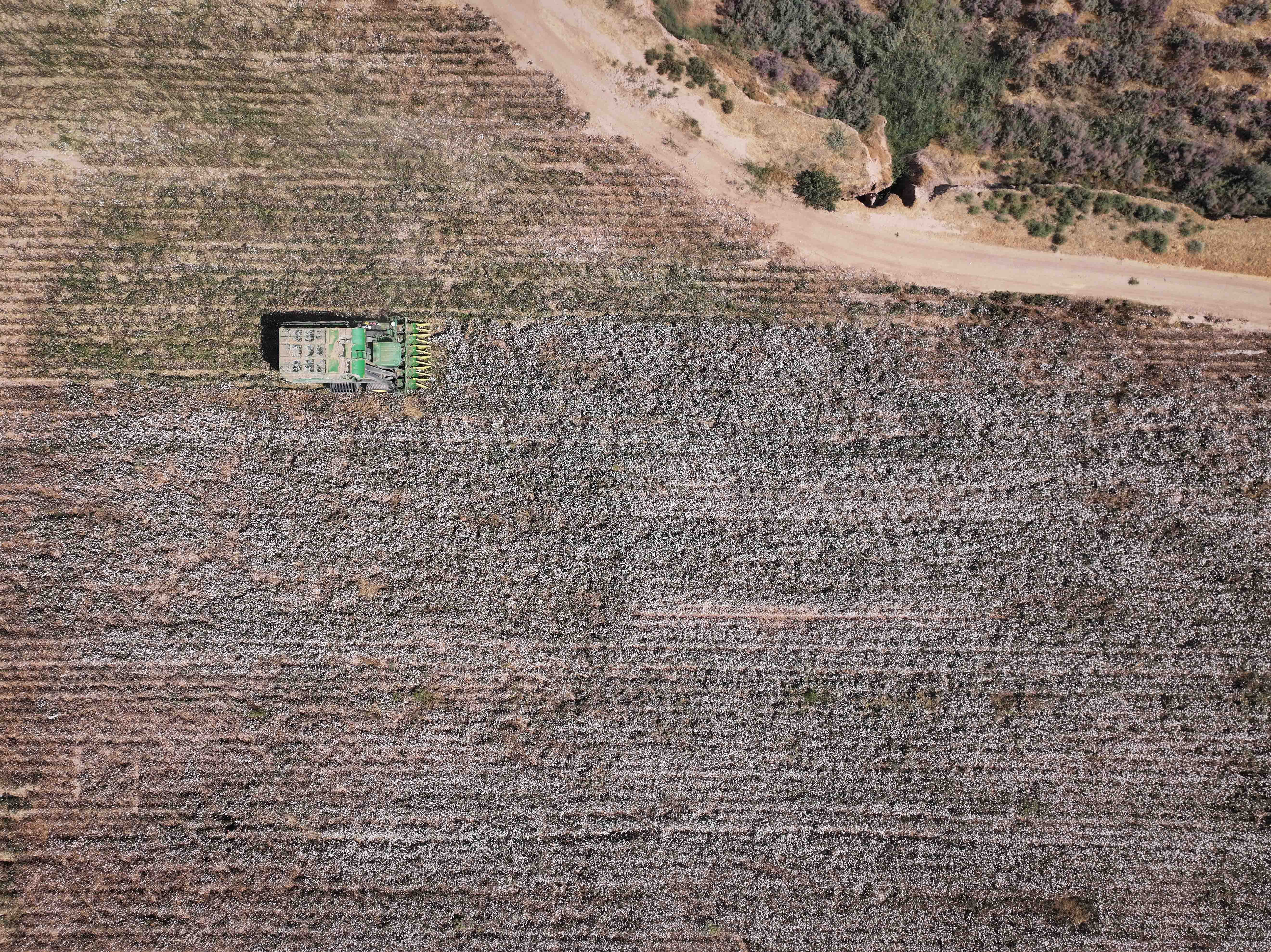 9月12日,在塔吉克斯坦哈特隆州丹加拉区,中塔合作项目丹加拉农业纺织产业园的采棉机在一片棉花地作业(无人机照片)。新华社记者 李任滋 摄