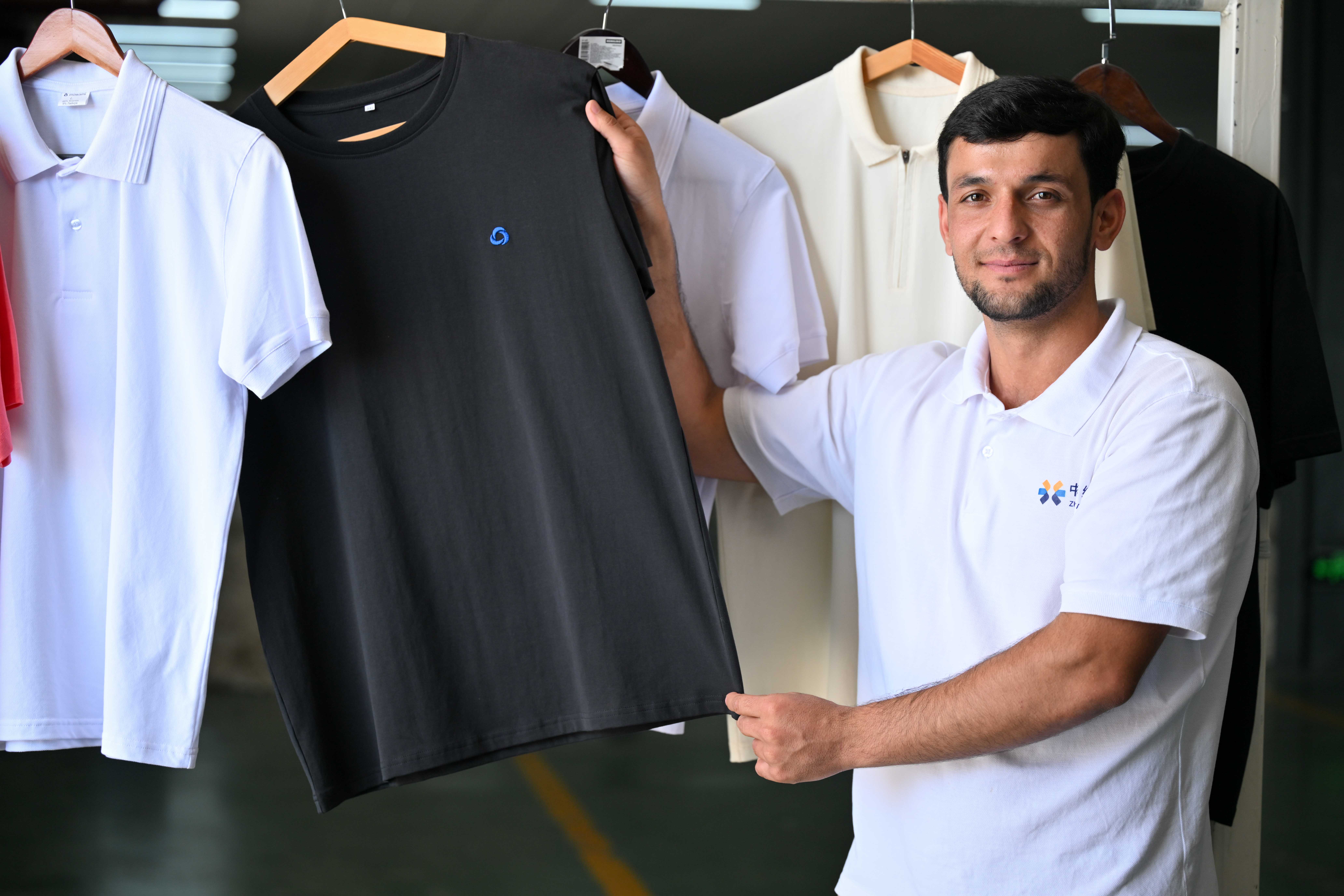 9月12日,在塔吉克斯坦哈特隆州丹加拉区的中塔合作项目丹加拉农业纺织产业园,塔方员工卡尤莫夫展示成衣样品。新华社记者 李任滋 摄