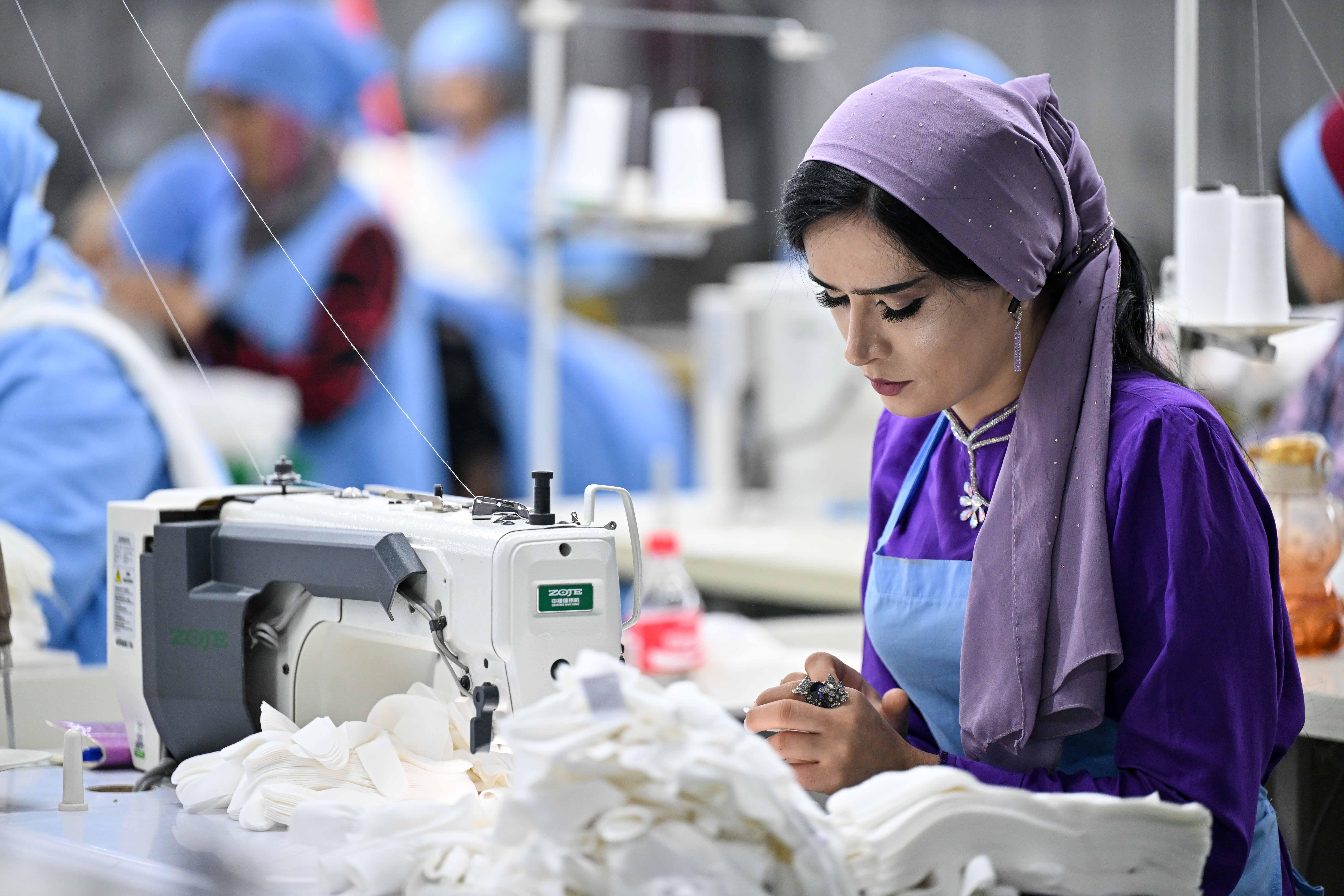 9月12日,在塔吉克斯坦哈特隆州丹加拉区,一名工人在中塔合作项目丹加拉农业纺织产业园成衣车间工作。新华社记者 李任滋 摄