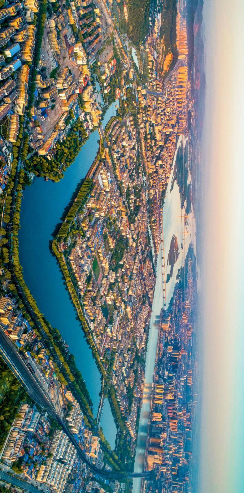 (请横屏观看,襄阳古城鸟瞰,近处水道为护城河,远处为汉江,是易守难攻的古城典范,摄影师@颜京利)