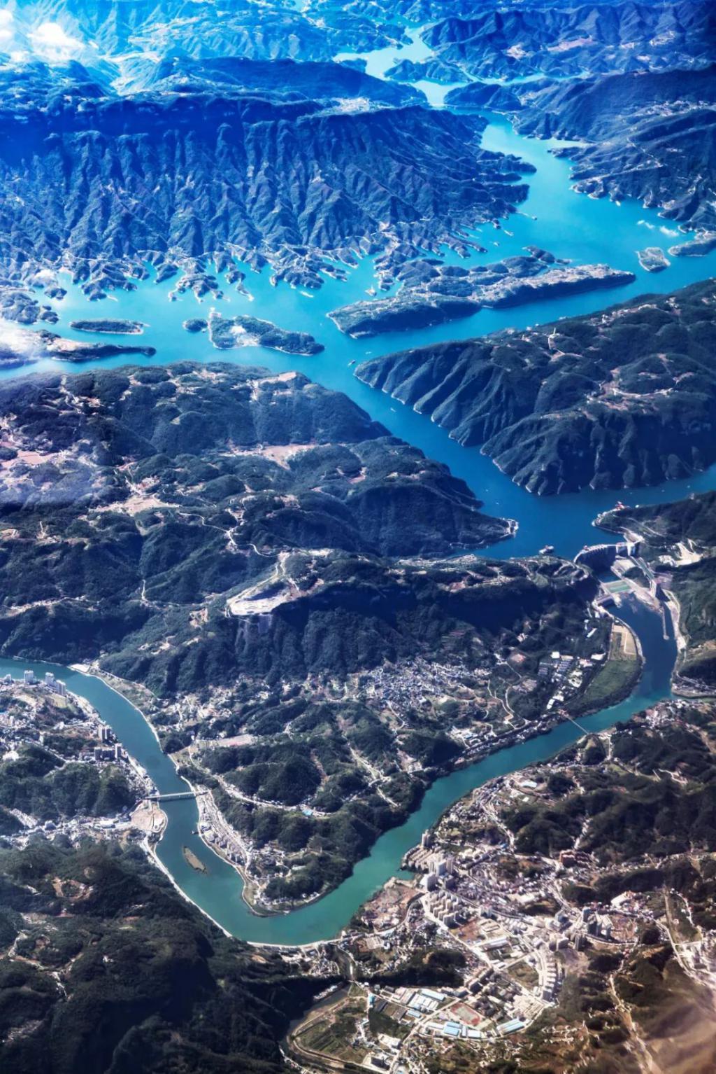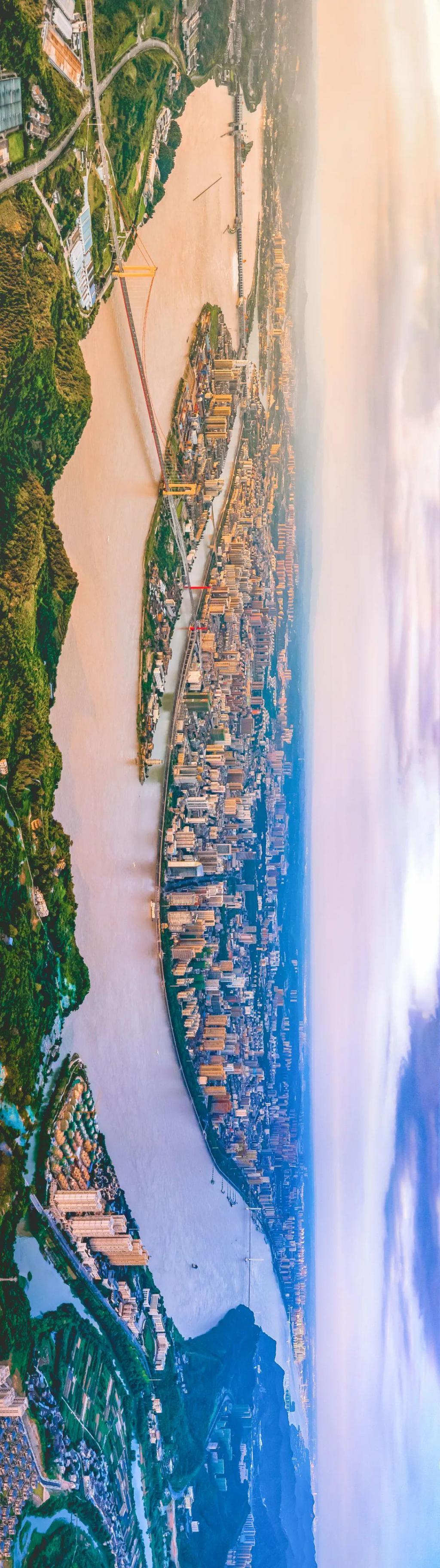 (请横屏观看,宜昌鸟瞰,是三峡工程所在地,被誉为"世界水电之都",画面左端水坝为葛洲坝,摄影师@李理)