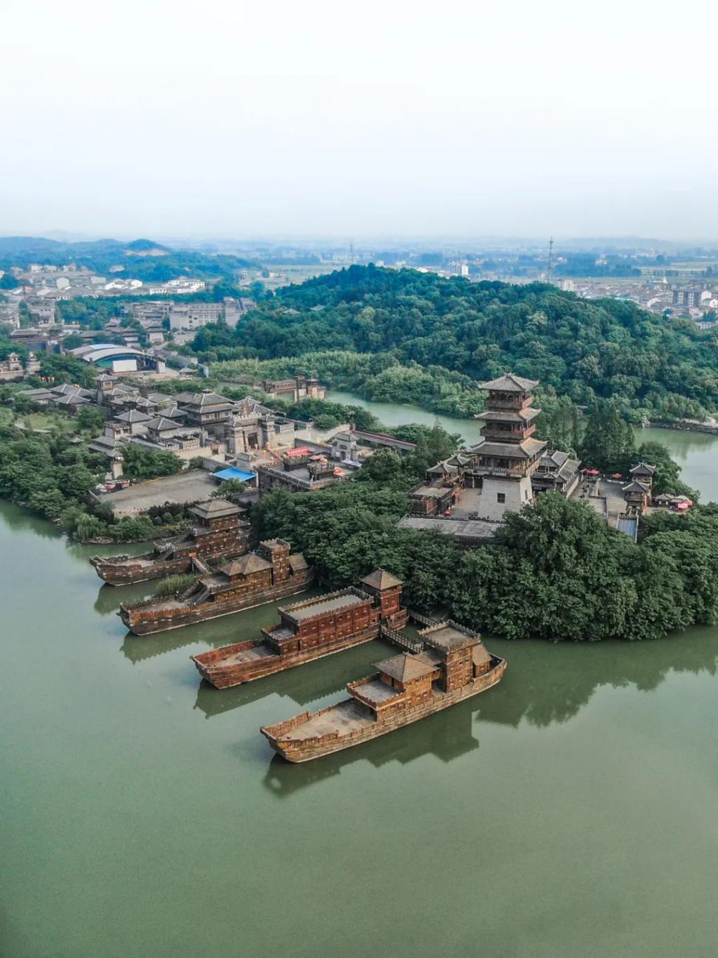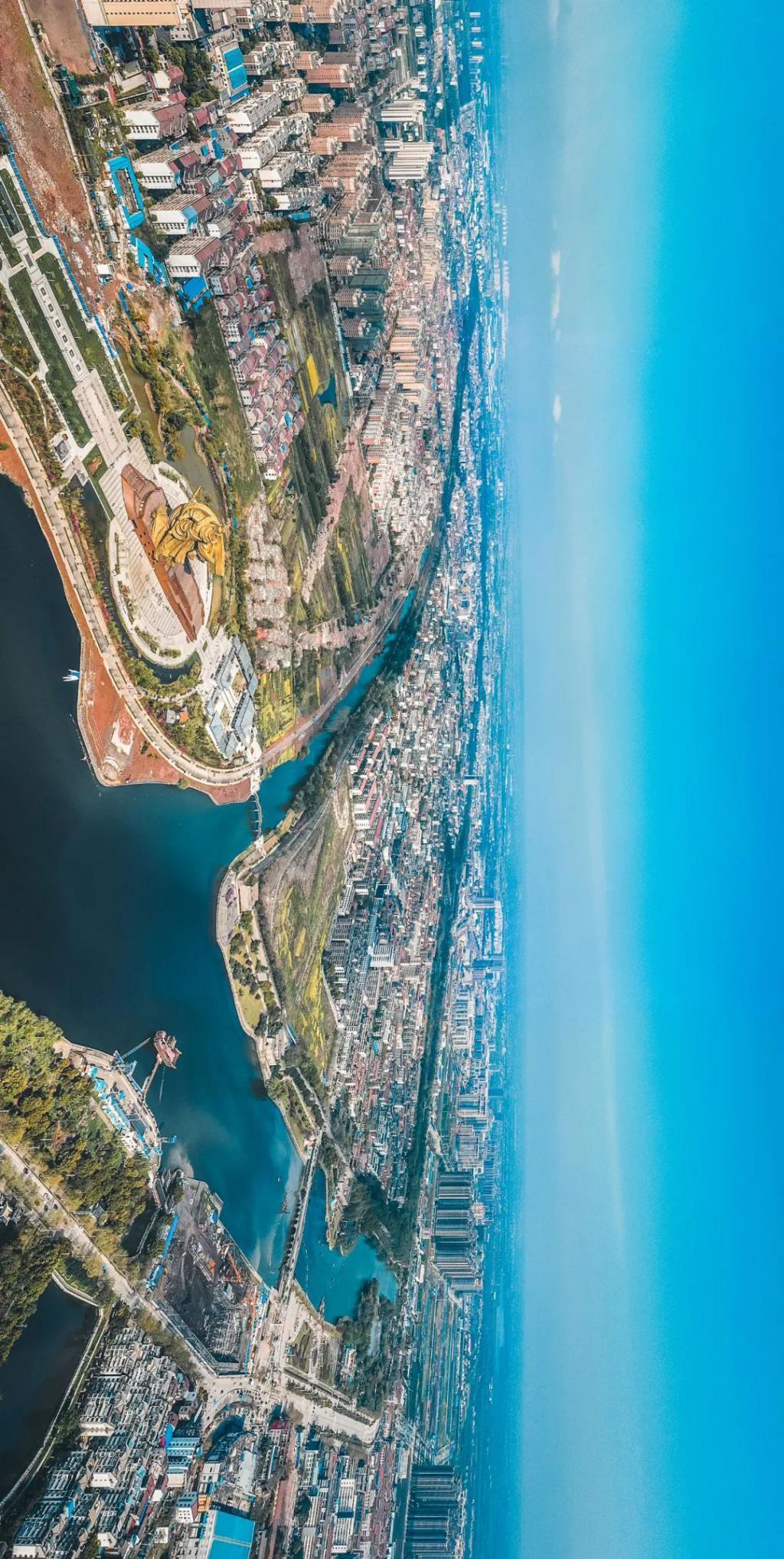 (请横屏观看,荆州古城鸟瞰,画面中部为荆州古城,外围一圈为护城河,左下为手持70米长刀的关羽像,摄影师@邓双)