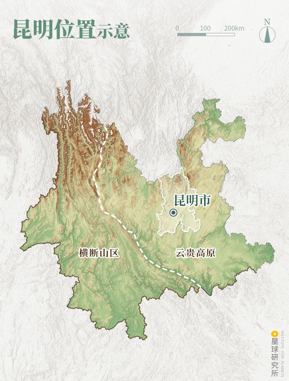 今天的昆明坐落在云贵高原之上与群山起伏的横断山区不同这里的地势相对和缓(昆明位置示意,制图@巩向杰&王申雯/星球研究所)▼