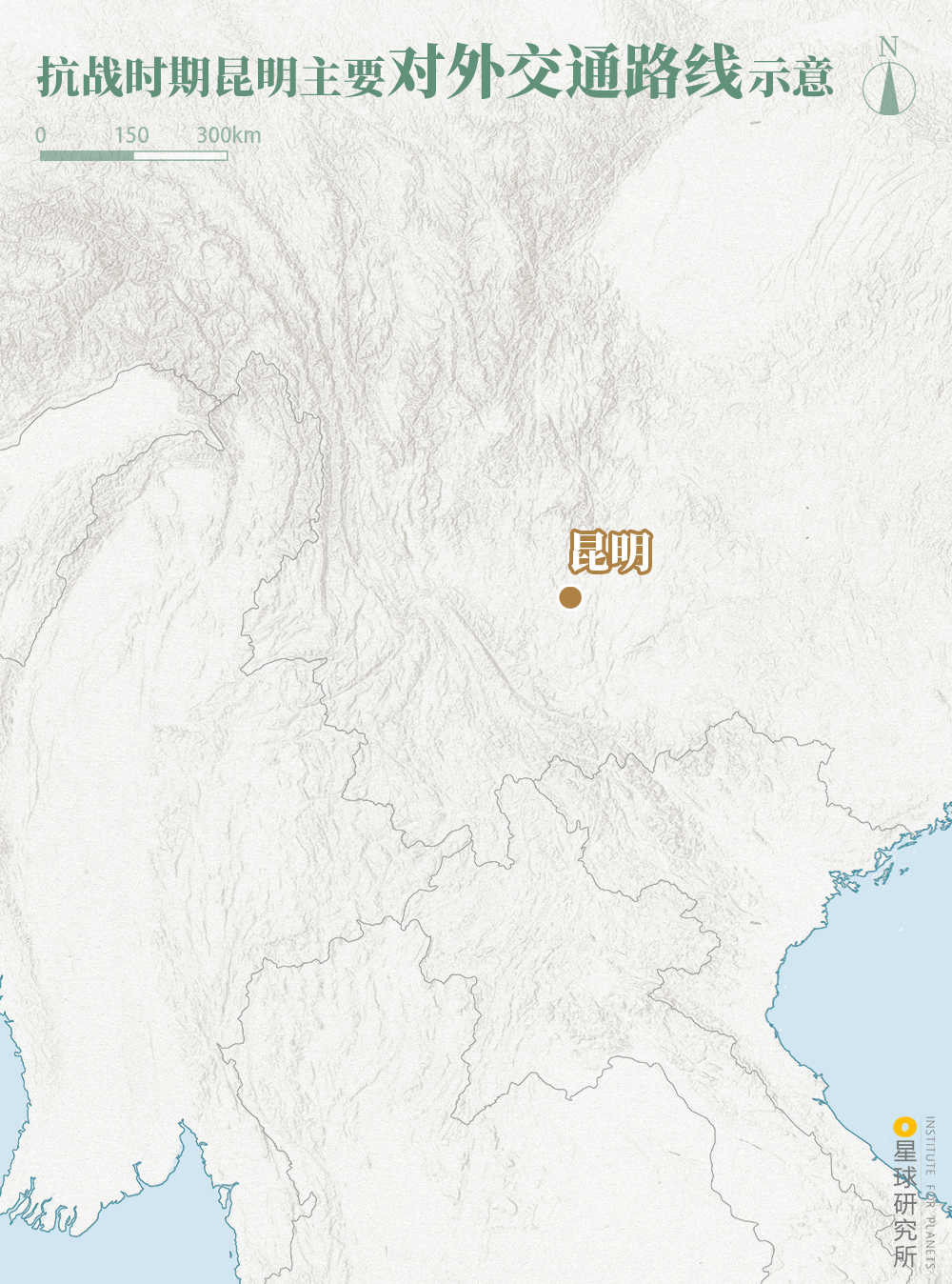 以昆明为起点战前便建有滇越铁路此后为防止滇越铁路被破坏又修滇缅公路而后滇缅公路被切断则再辟驼峰航线可谓一次又一次在敌人的轰炸和封锁中夹缝求生(抗战时期昆明主要对外交通路线图,制图@巩向杰&王申雯/星球研究所)▼