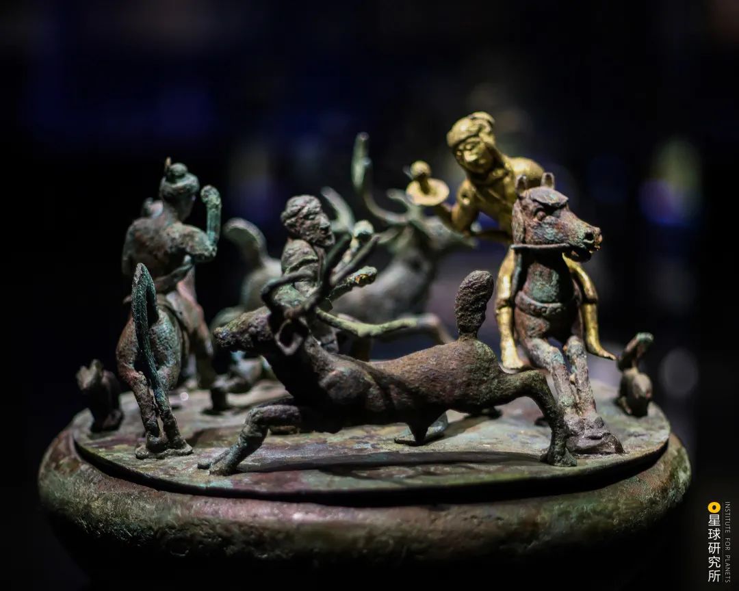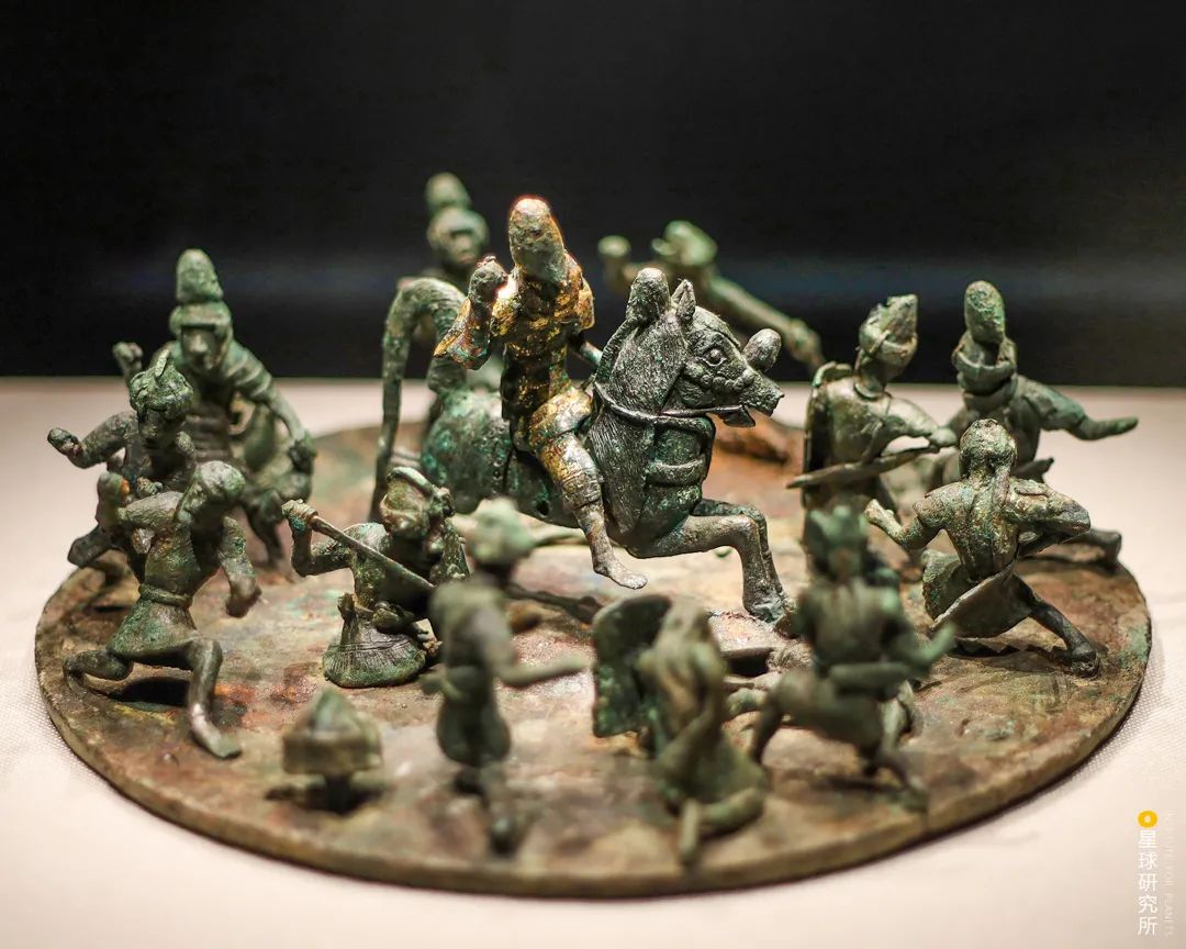 尽管此后神秘的滇国再没留下文字史料却史无前例地利用青铜器记录下了当时的社会百态从动物、人物、建筑到战争、狩猎、祭祀(西汉时期二人盘舞鎏金铜扣饰,人物身着长裤,形态独特,出土于石寨山古墓群,摄影师@苏李欢)▼