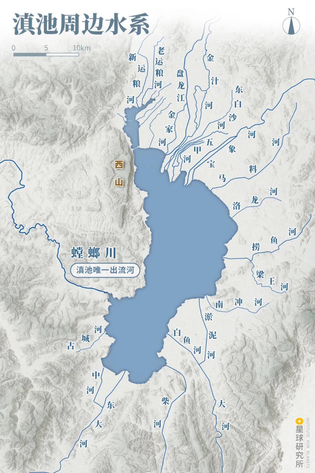 曾几何时滇池的入流河道多达35条但出流河道却仅有1条加之降水集中、河道淤塞往往旱季灌溉缺水、田地干涸雨季却洪水漫溢、泛滥成灾(滇池周边水系,制图@巩向杰&王申雯/星球研究所)▼