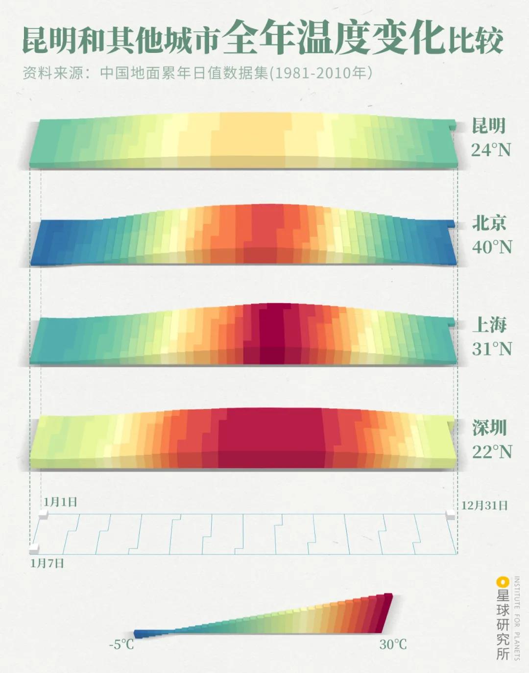最终昆明的夏季变得潮湿且凉爽冬季则干燥而温暖(昆明和其他城市全年温度变化比较,制图@巩向杰&王申雯/星球研究所)▼