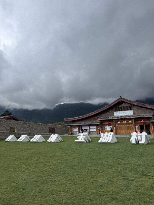 来到村子,率先映入眼帘的是具有纳西族传统风格的游客中心,平添了几分宁静与安逸。远处云雾缭绕,连绵的玉龙雪山若隐若现。前方广阔的草坪如绿毯铺开,“纳西秘境玉湖村”的立体大字格外醒目,像在热情招呼远方的游客踏入这方世外桃源。