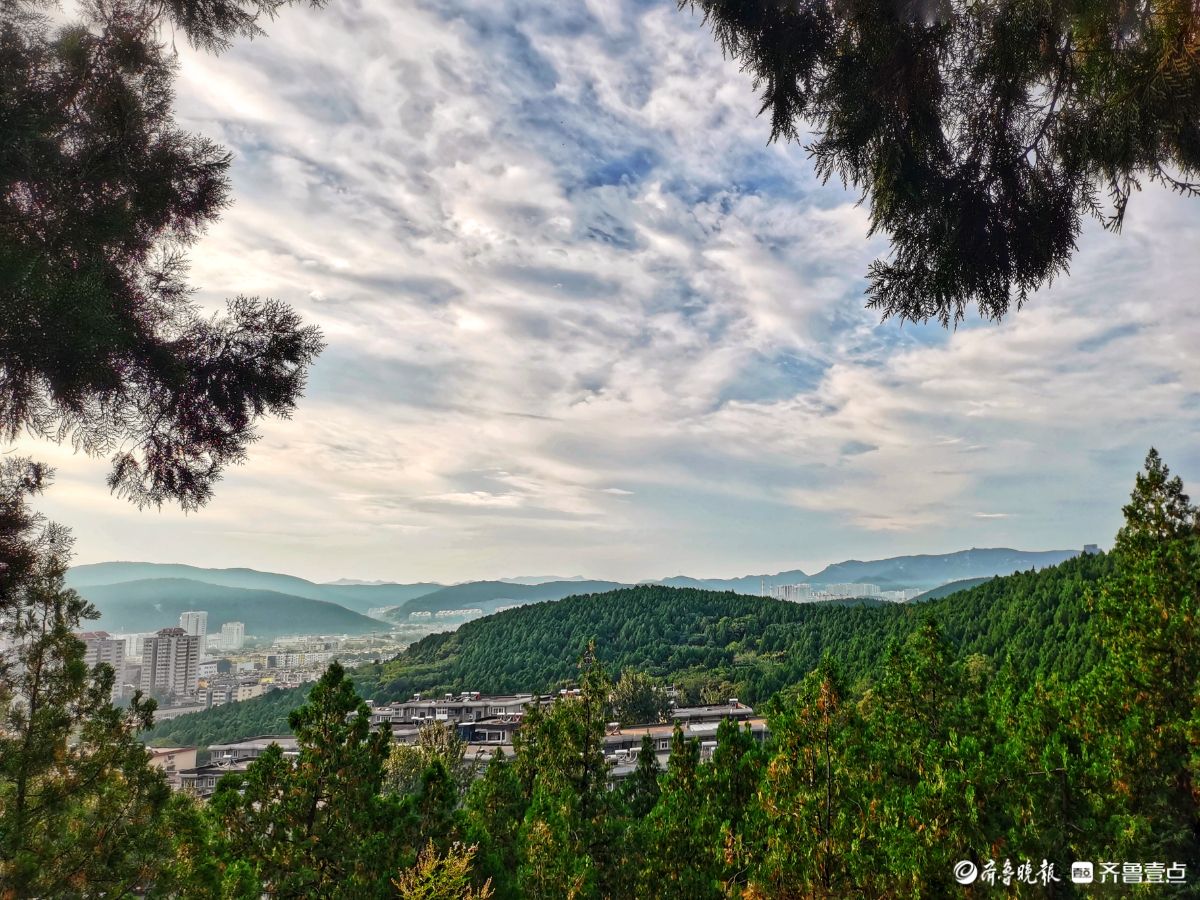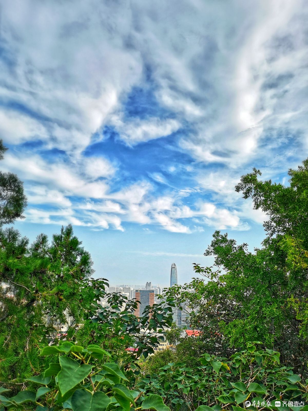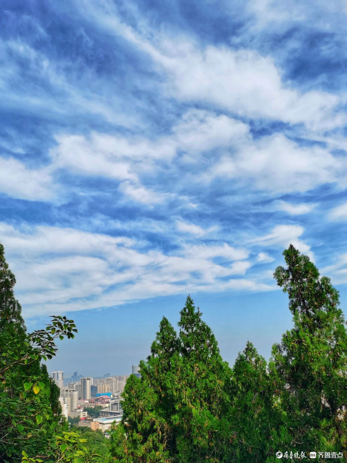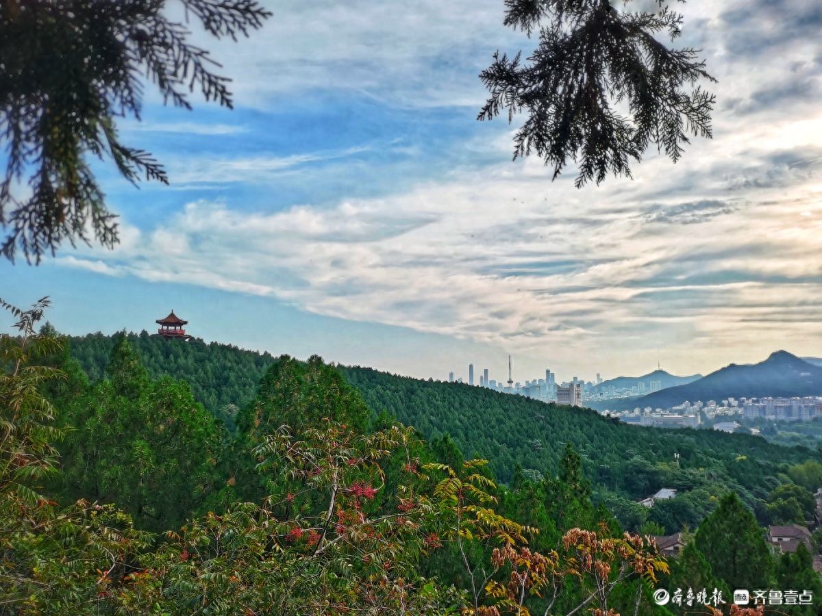 这是一幅描绘济南英雄山秋景的图片,蓝天白云映衬下,层林尽染,秋意盎然。
