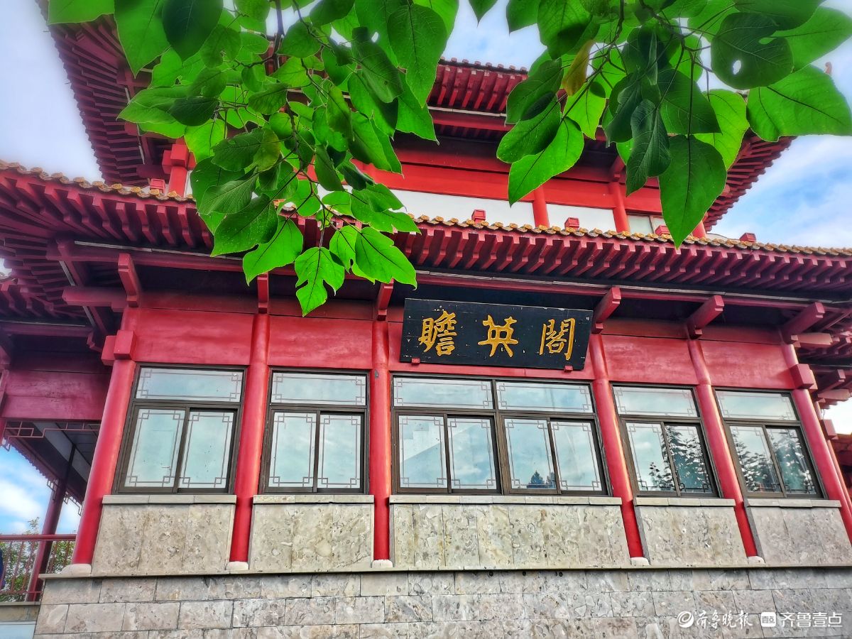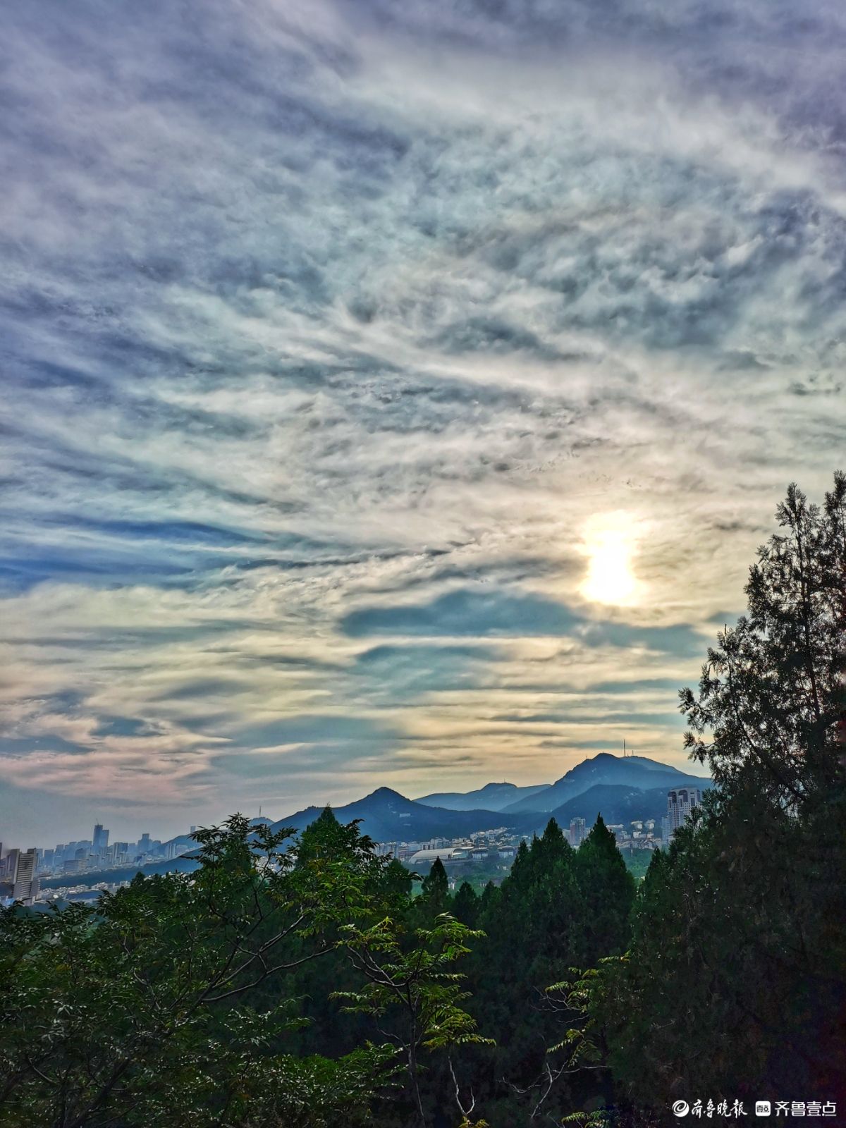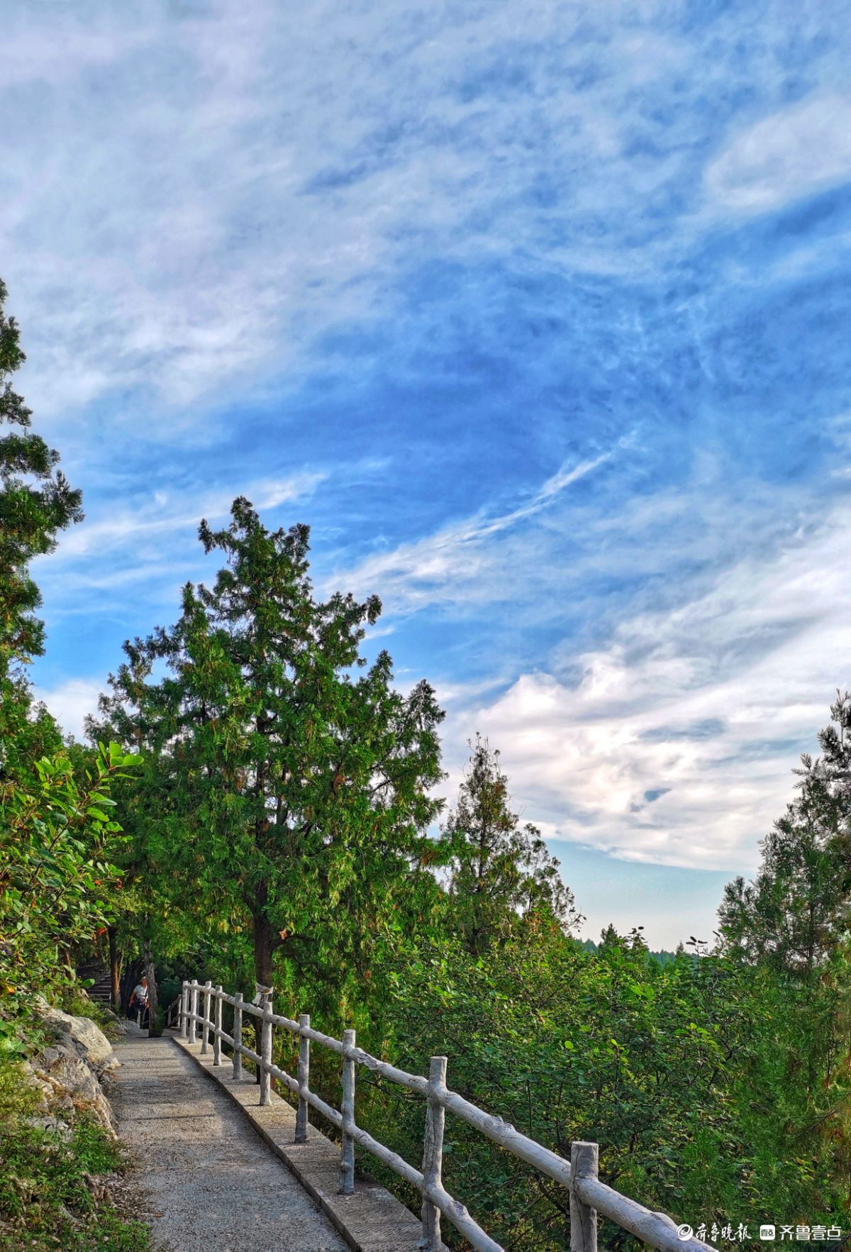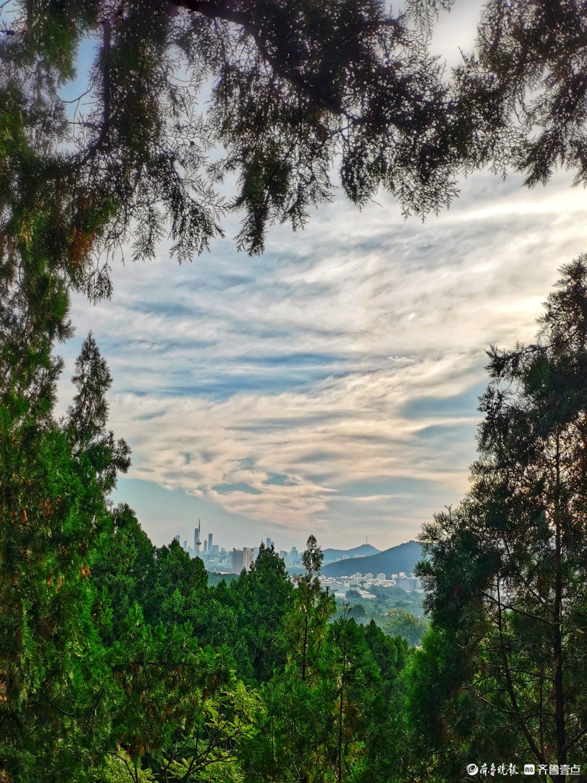 这是一幅描绘济南英雄山秋景的图片,蓝天白云映衬下,层林尽染,秋意盎然。