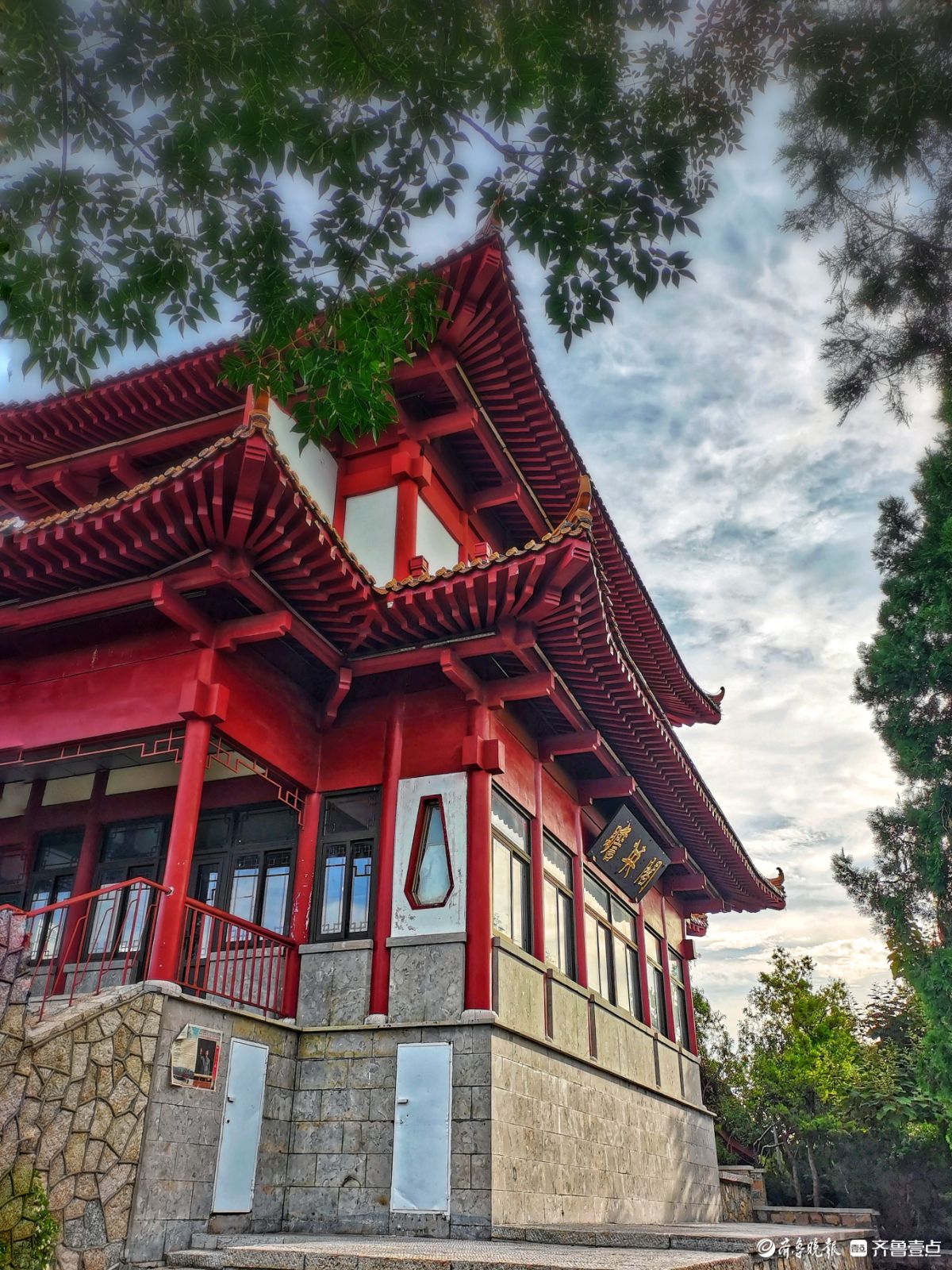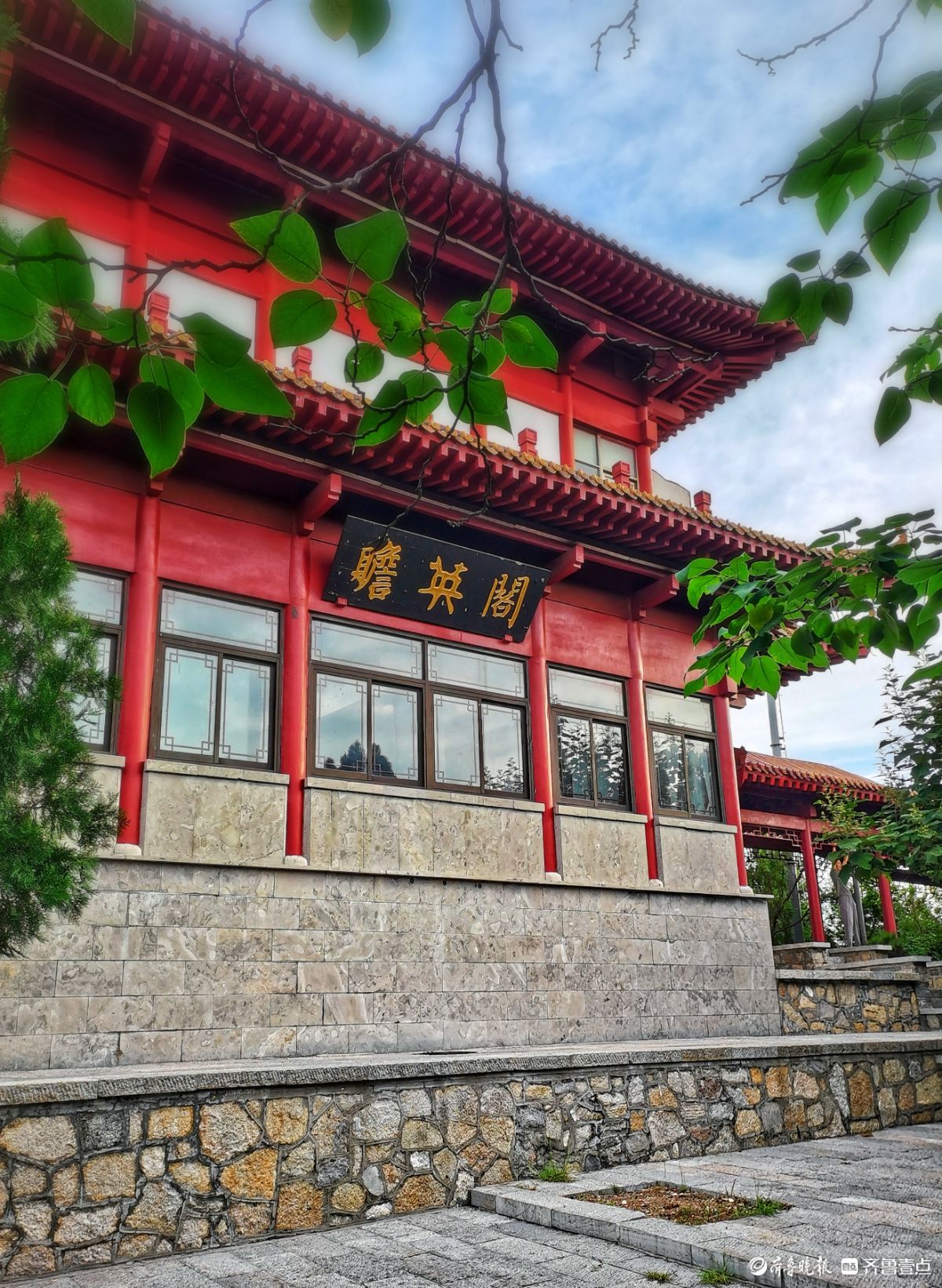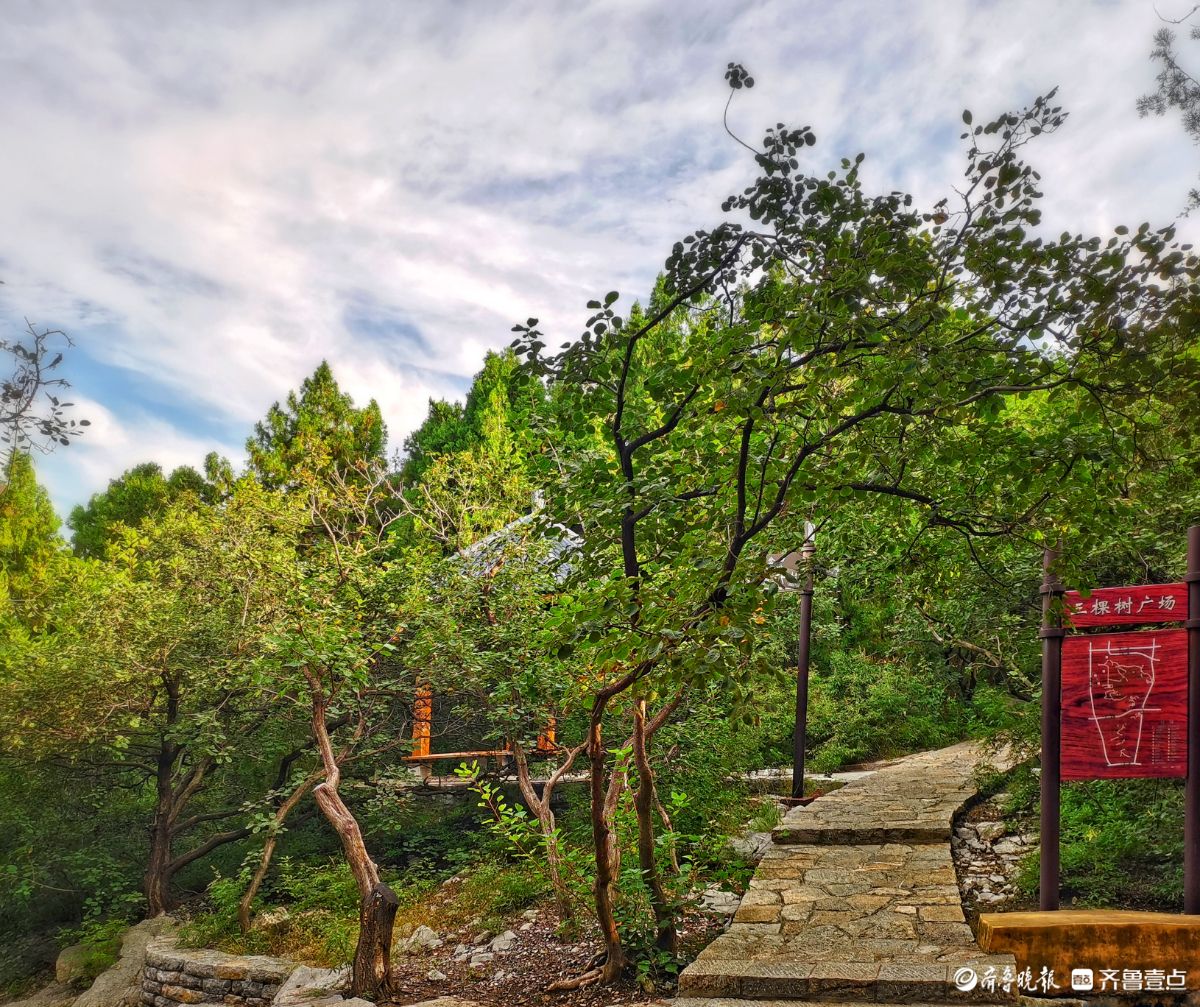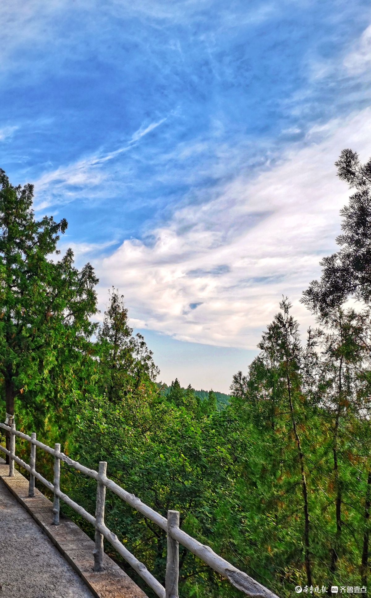 这是一幅描绘济南英雄山秋景的图片,蓝天白云映衬下,层林尽染,秋意盎然。