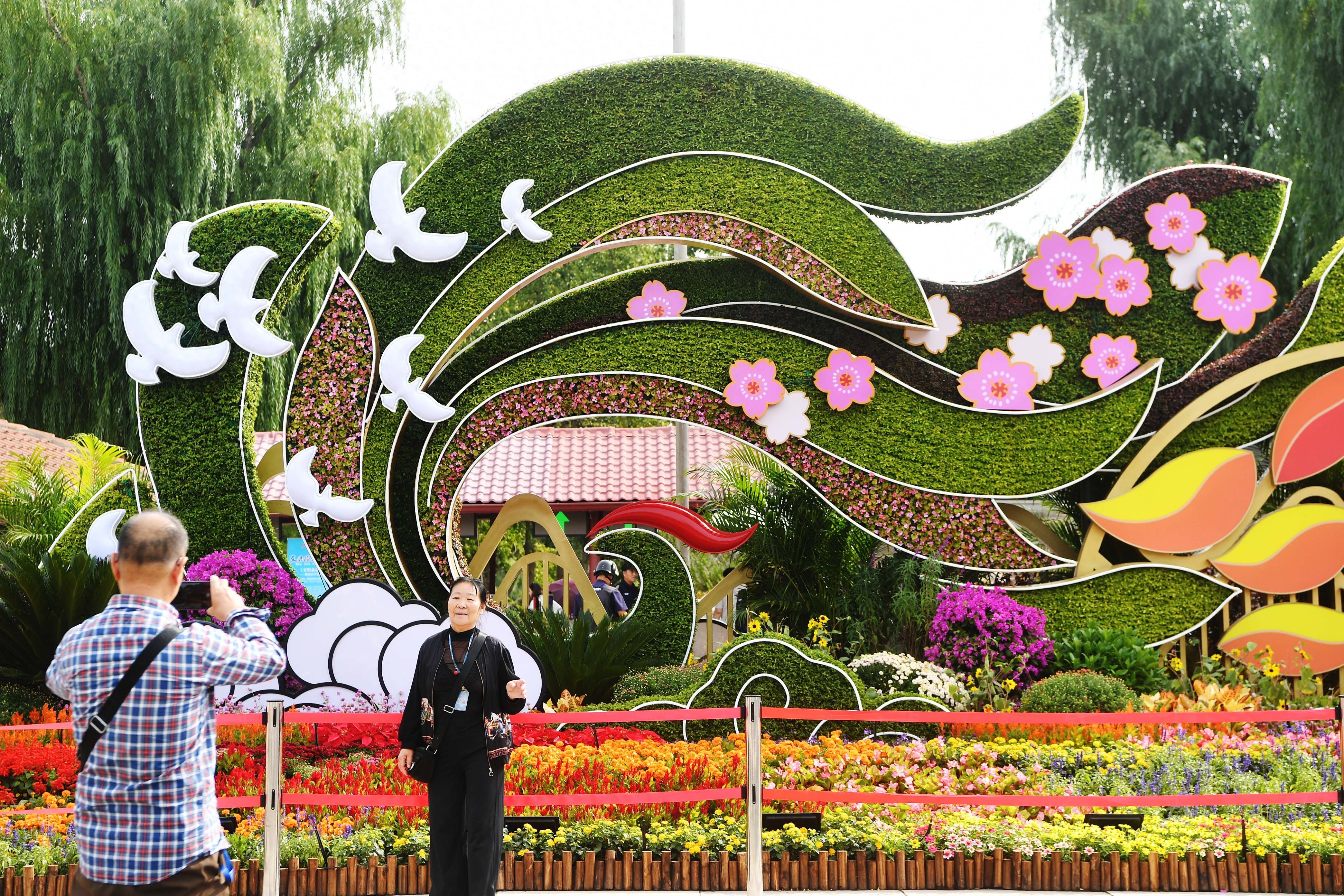 在玉渊潭公园西门,不少游客手持国旗与“凤舞樱华”国庆立体花坛合影留念。花坛展现凤凰衔瑞、踏云而来的灵动画面。公园的花坛设计师为游客讲解花坛设计理念、花卉选材、制作工艺与养护知识。此外,公园还分别在西北门和樱花园大草坪精心打造了“彩色星河”与“桂语花汀”两处花园造景,前者以“彩虹瀑布”与“花卉行星”营造梦幻视觉,后者则将桂花融入花卉景观,让游客在馥郁香气中感受金秋韵味。