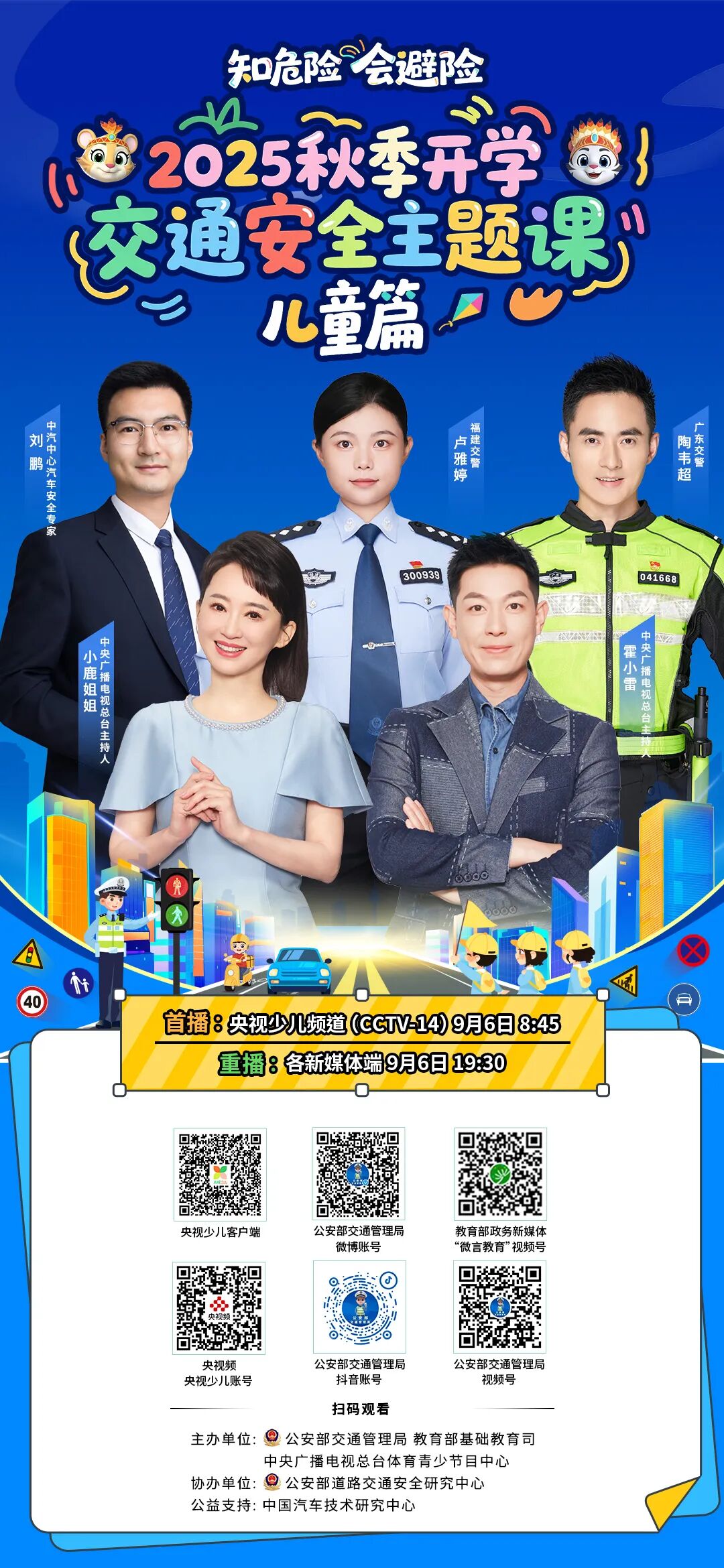 叮铃铃~清脆的铃声响起,新的学年也揭开了崭新一页~公安部交通管理局、教育部基础教育司、中央广播电视总台体育青少节目中心联合录制的“知危险 会避险”2025年秋季开学交通安全主题课如约和大家见面了。