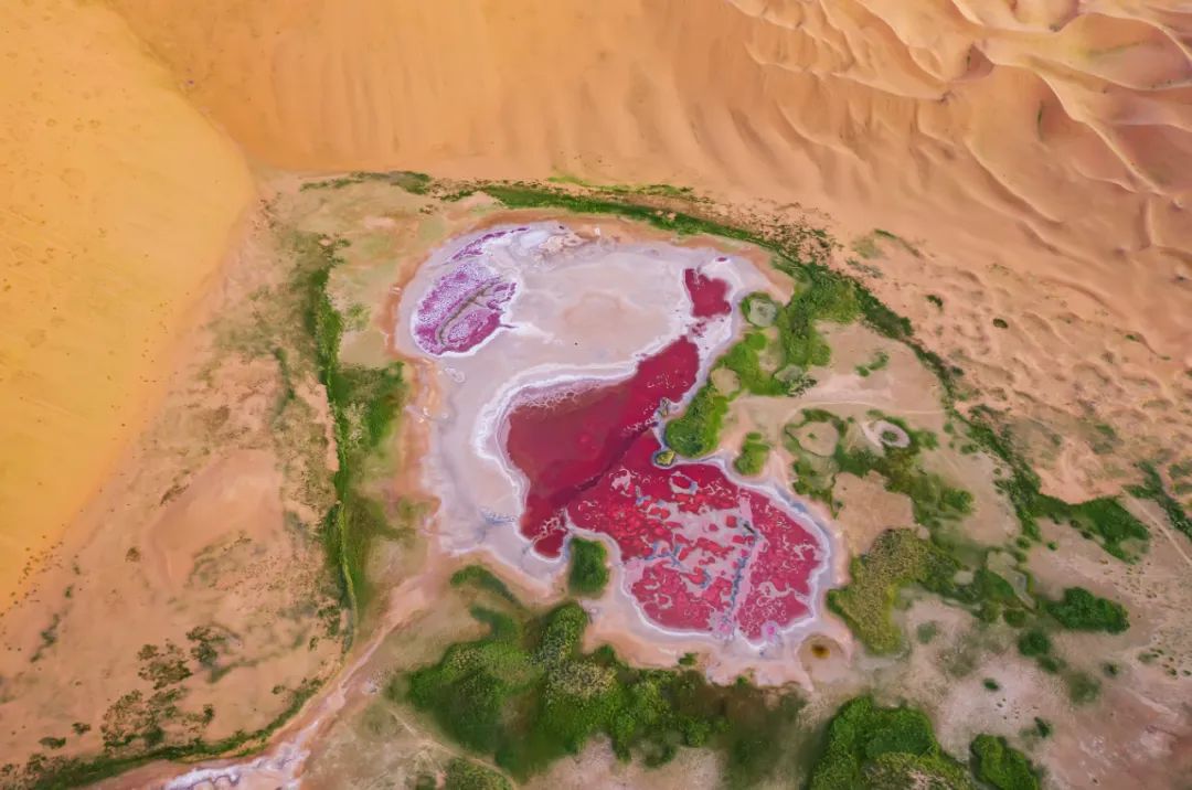 最奇特的要数红海子,又名达格图湖,位于巴丹吉林沙漠之中,这里的盐湖是红色,站在高处凝视它仿佛在凝视一个血色湖泊一般,有一种别样的诡异之美。