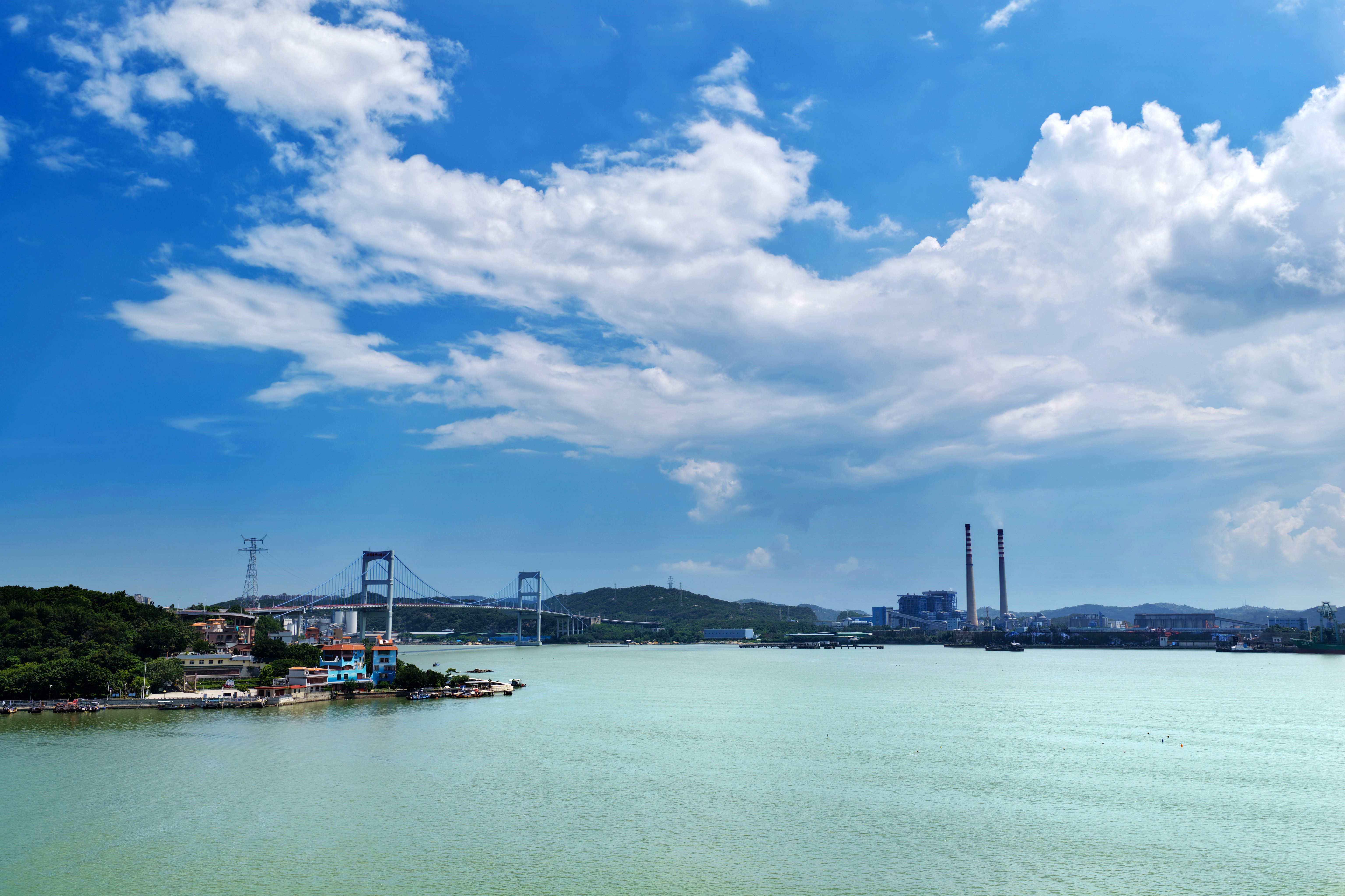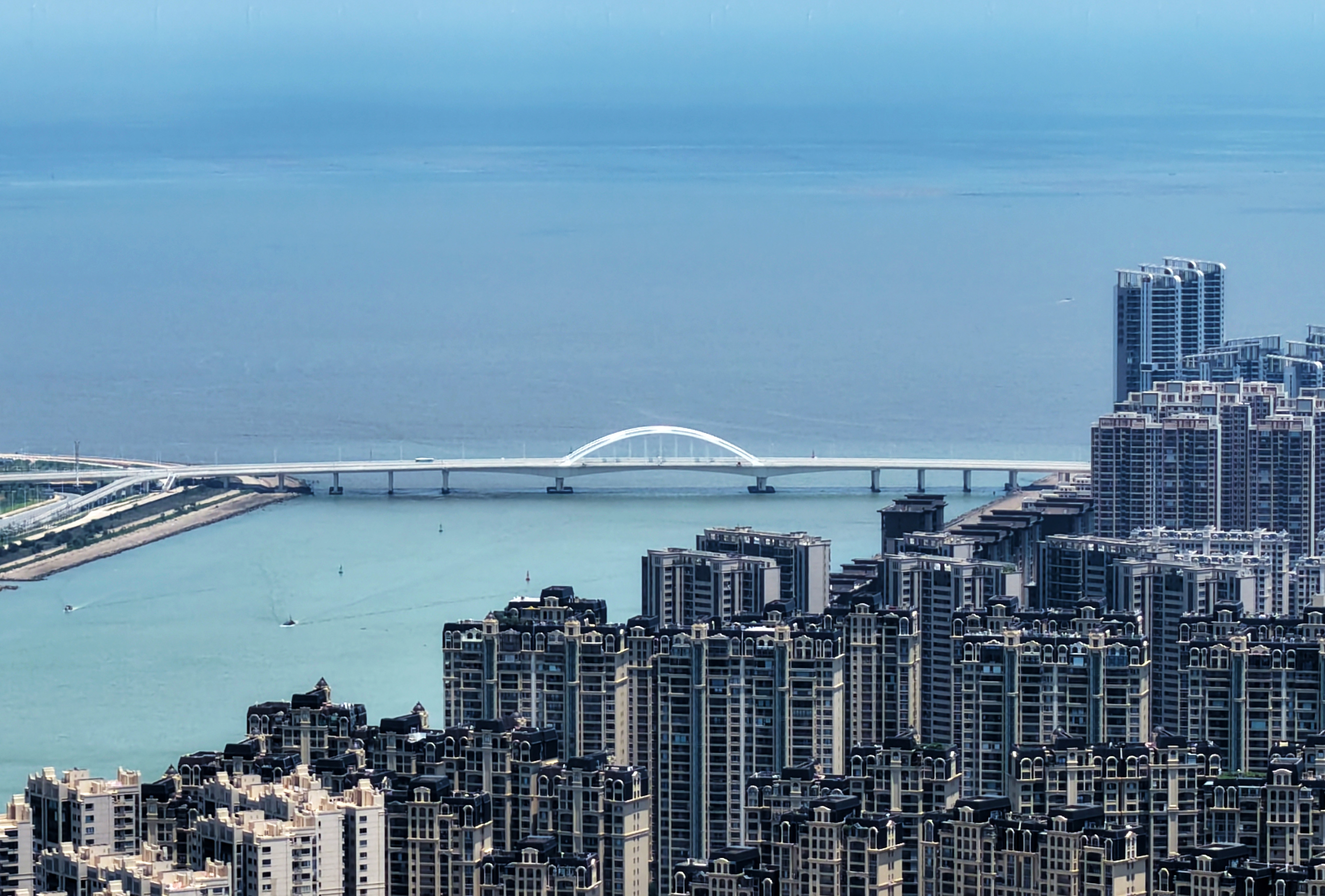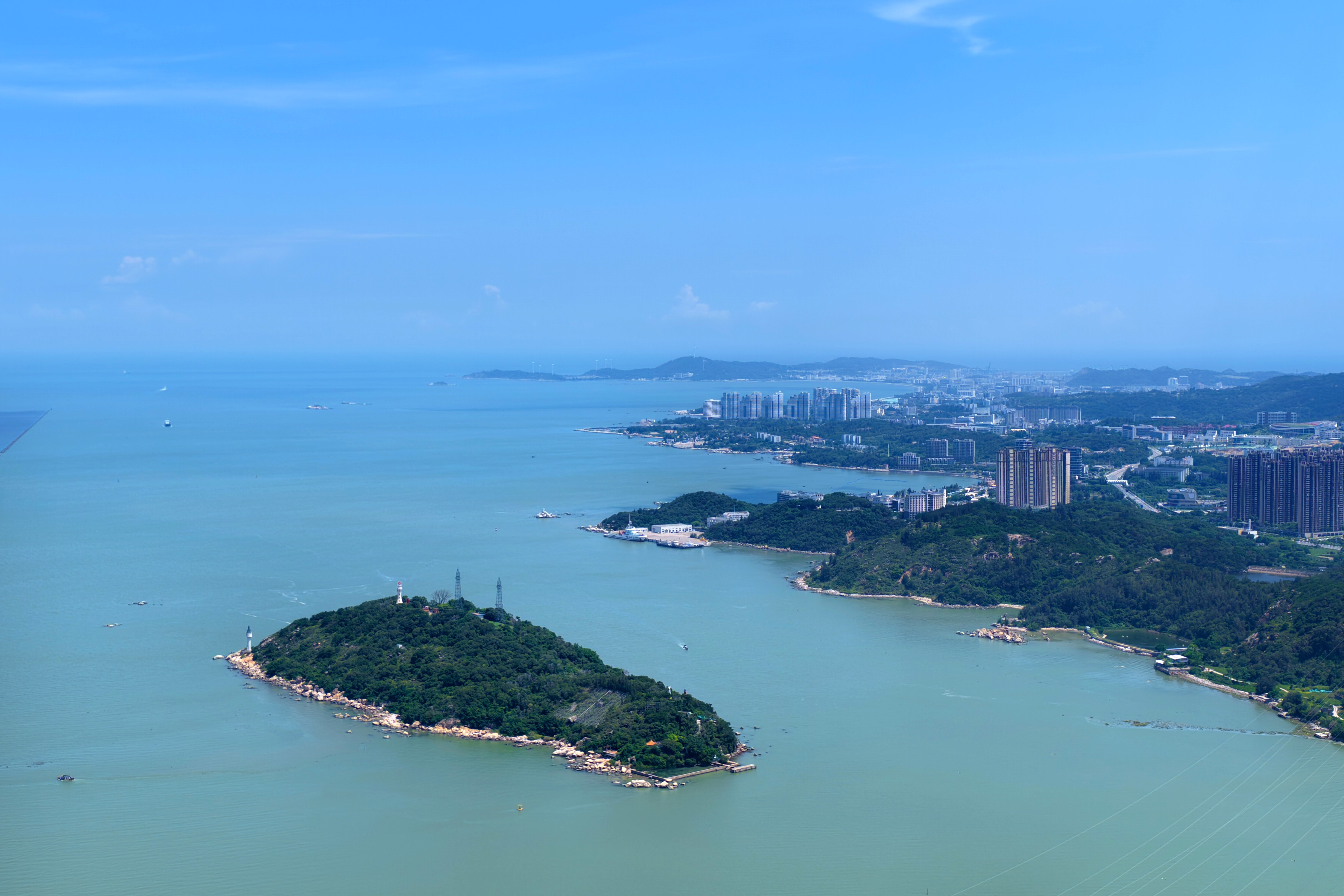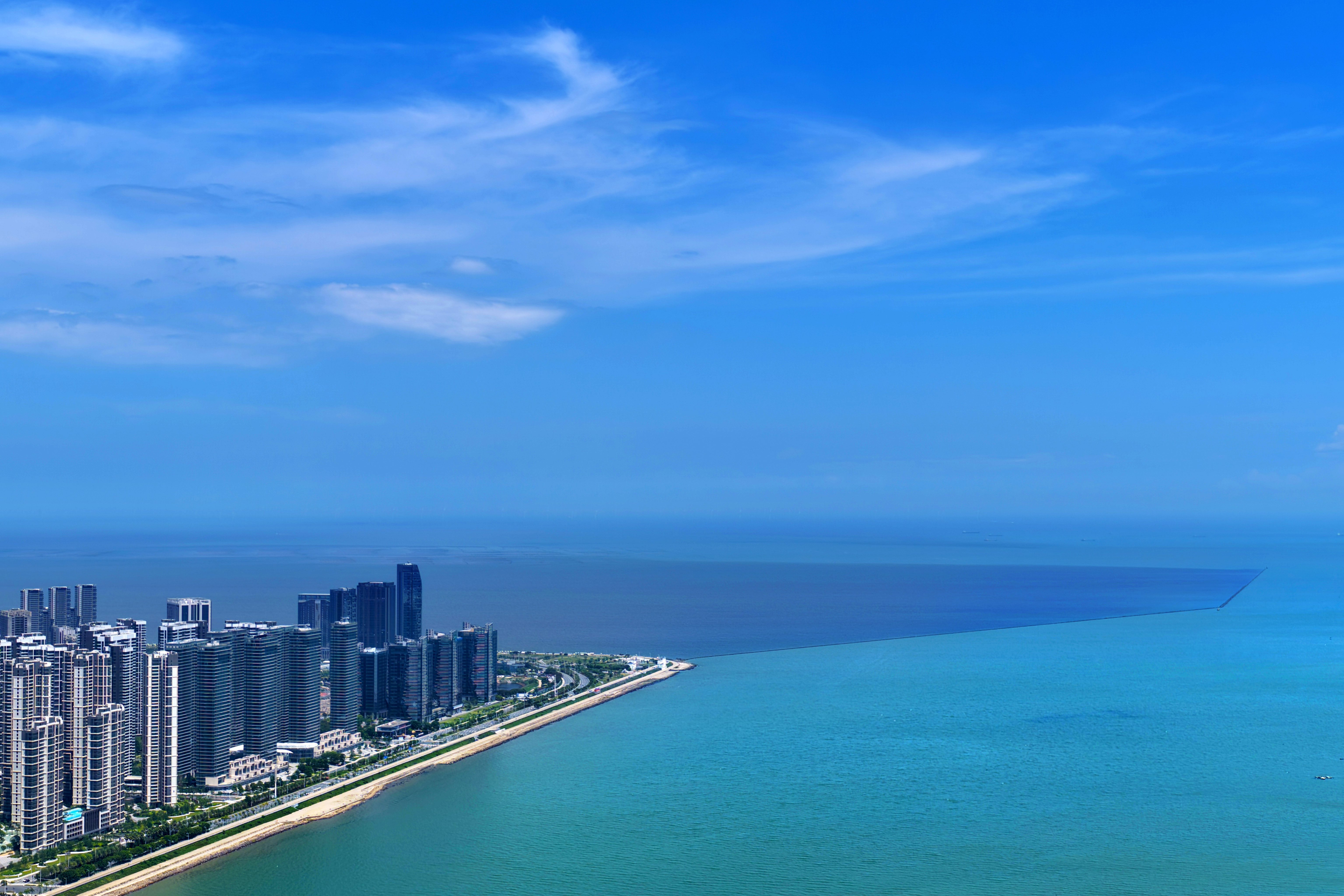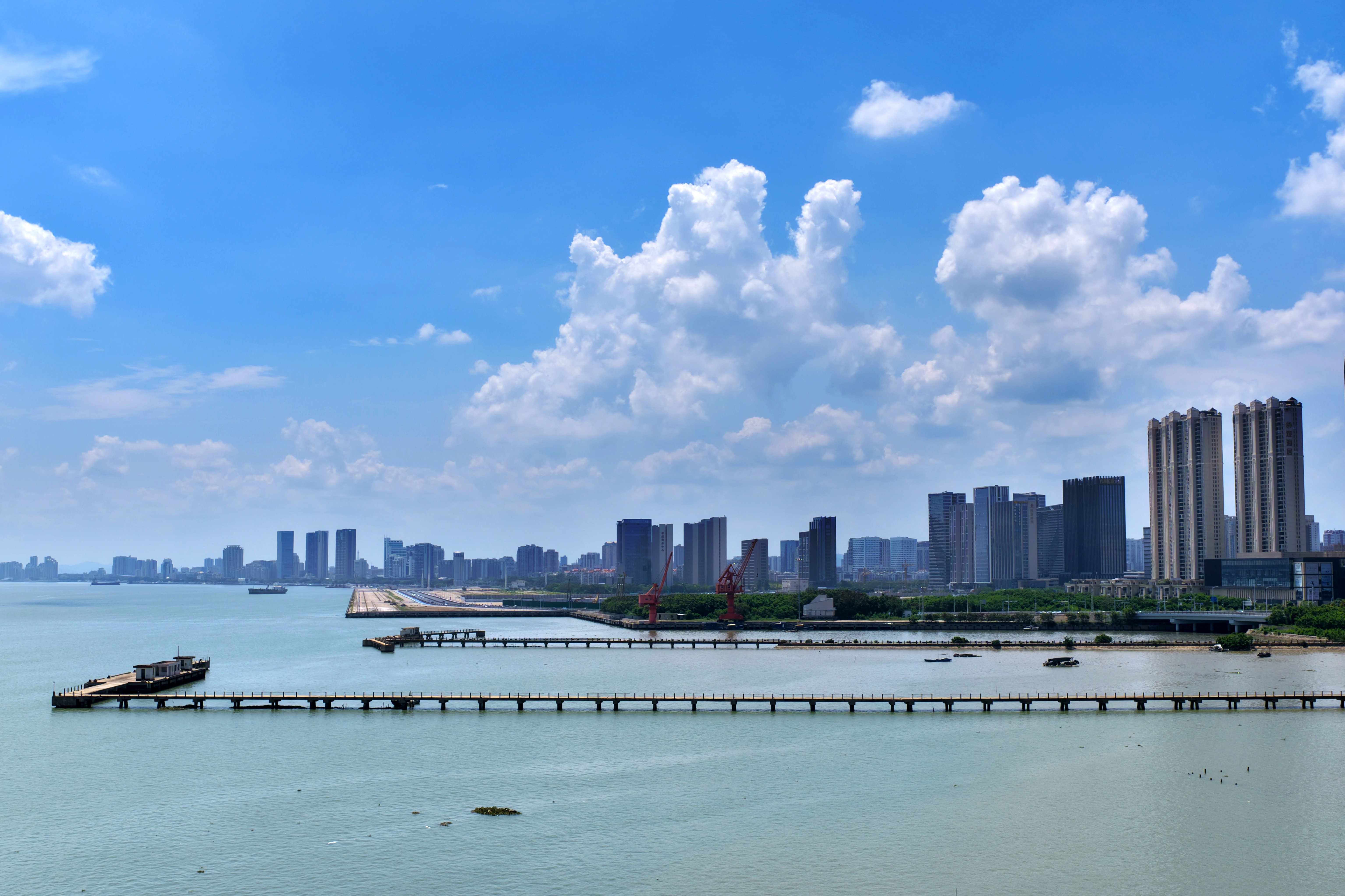 近日,广东省汕头市龙湖区天气晴朗,碧海蓝天与城市建筑相互映衬,构成一幅美丽的夏日风景画。