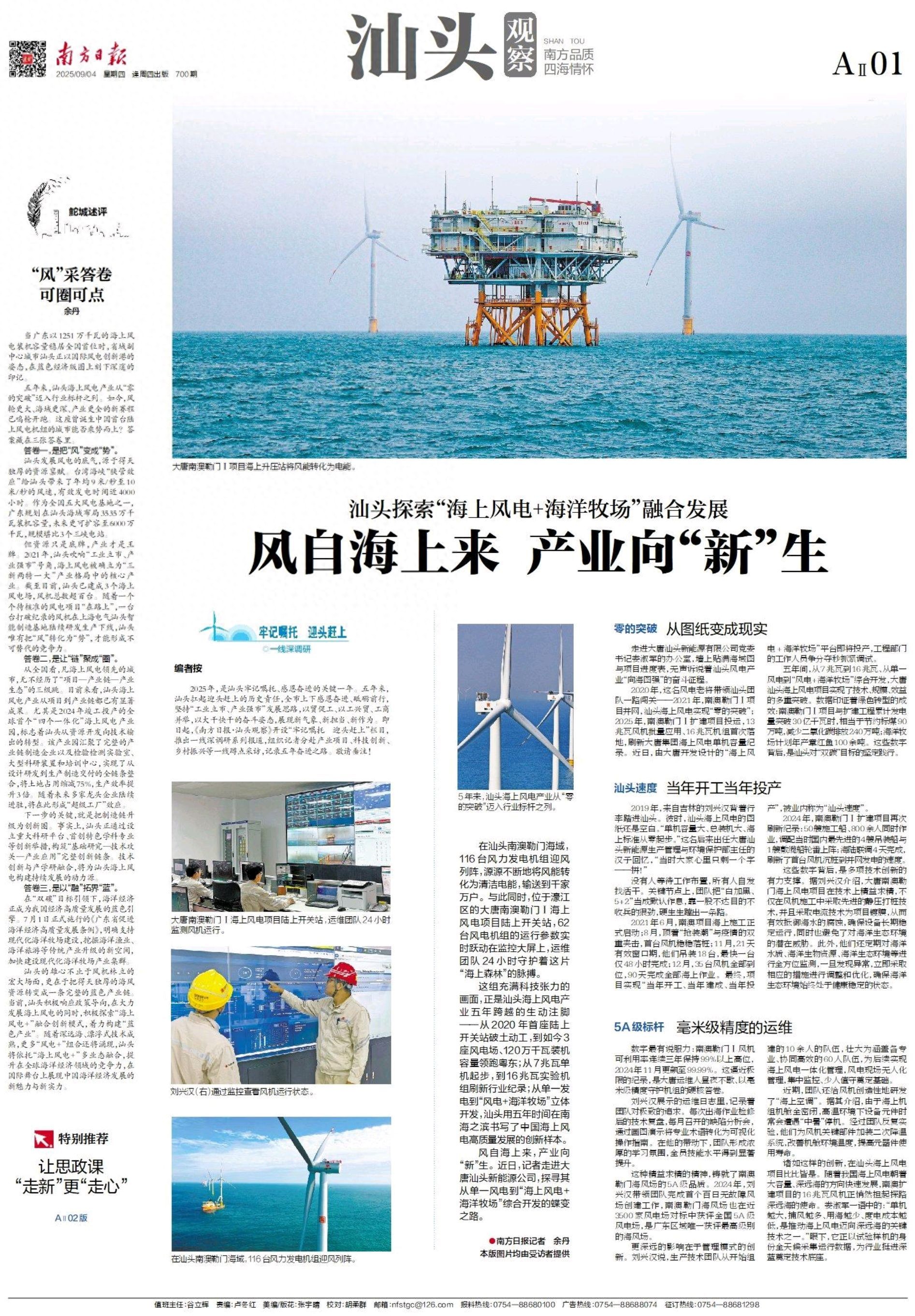 诸如这样的创新,在汕头海上风电项目比比皆是。随着我国海上风电朝着大容量、深远海的方向快速发展,南澳扩建项目的16兆瓦风机正悄然担起探路深远海的使命。娄淑军一语中的:“单机越大,捕风越多、用海越少、度电成本越低,是推动海上风电迈向深远海的关键技术之一。”眼下,它正以试验样机的身份全天候采集运行数据,为行业挺进深蓝奠定技术底座。