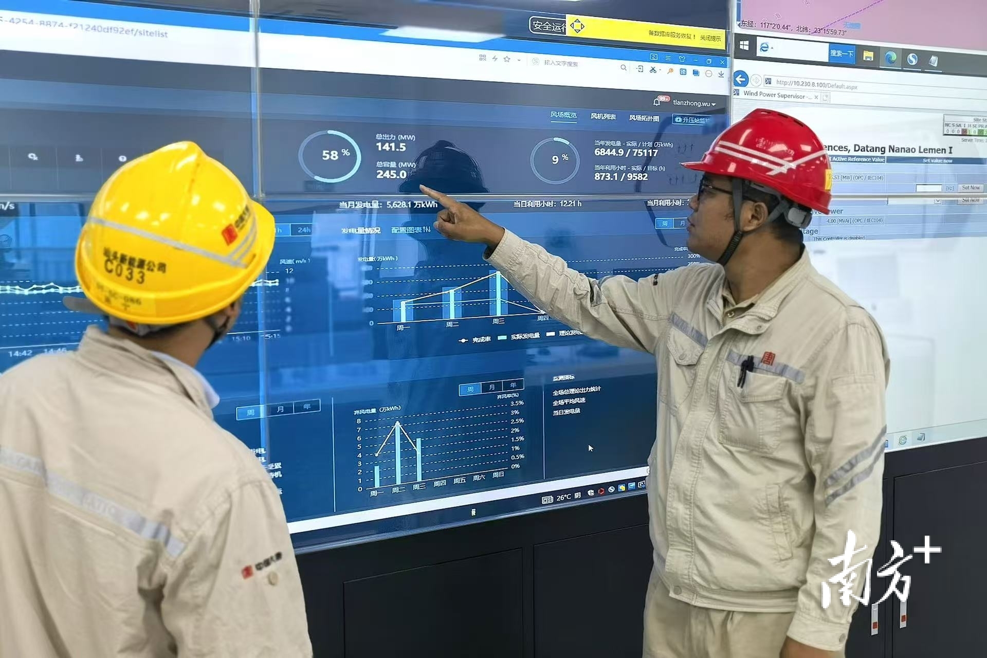刘兴汉(右)通过监控查看风机运行状态。 受访者供图