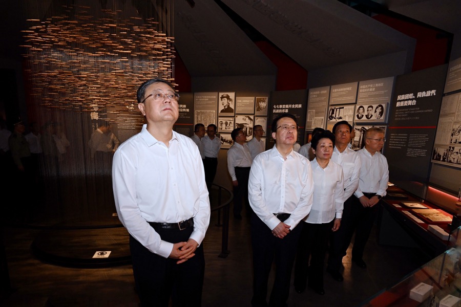 在上海淞沪抗战纪念馆,上海市领导与各界群众代表等共同参观了“同仇敌忾 共赴国难——上海抗战主题展”,认真听取讲解,不时驻足凝视,重温上海抗战的峥嵘岁月和这座光荣之城的精神品格,更加深刻感悟中国共产党领导抗日军民同仇敌忾、勇御外侮的光辉历史,更加深刻领悟伟大爱国主义精神、伟大抗战精神。