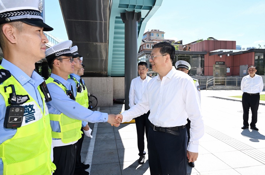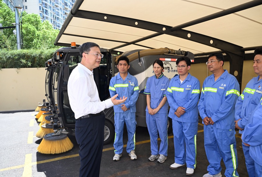 陈吉宁先后前往延安路、华山路路口执勤岗点和法华镇路905弄环卫道班房,慰问一线执勤民警、辅警和环卫工人,仔细询问一线工作者们的排班安排、后勤保障等情况,了解高温天气中的交通管理、垃圾清运等工作情况。