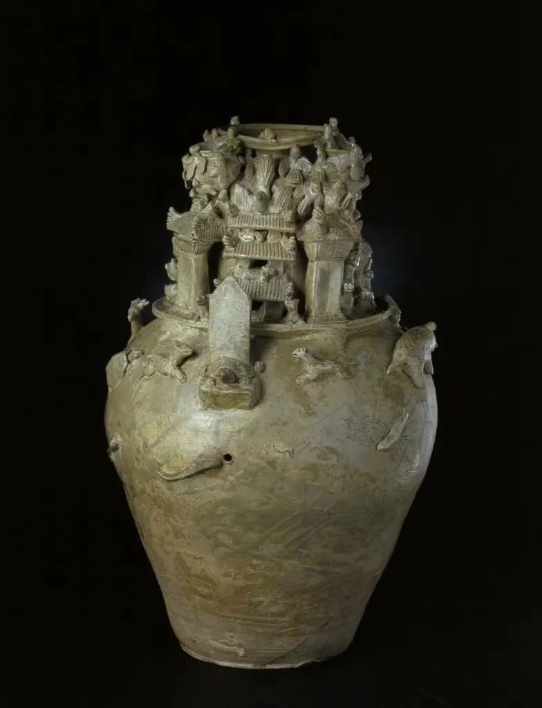 “洪范八政,食为政首。”解决好民众吃饭问题,是治国理政的头等大事。流行于三国和西晋时期的谷仓罐,由东汉的五联罐演变而来,有陶、瓷制品。北京故宫博物院收藏着一件三国时期的青釉堆塑谷仓罐,其作为当时的随葬用品,在秉持“事死如事生”观念的古代,成为见证“粮安天下”治理智慧的重要载体。谷仓上半部堆塑多种饰物,三层崇楼居中,一层两侧各有一条狗把门,楼檐之上有栖息的鸟和觅食的老鼠。崇楼两侧各立一亭阙,阙下有8位侍仆,各执不同乐器,正聚精会神地演奏乐曲。谷仓顶部堆塑5只相连的罐子,大罐居中,一鼠正从罐口爬出;四小罐分列大罐四角,周围簇拥着伸颈觅食的雀鸟。谷仓下半部为完整的青瓷罐形,罐肩部其他部位塑贴龟驮碑,碑上刻“永安三年时富且洋(祥)宜公卿多子孙寿命长千意(亿)万岁未见英(殃)”24字。龟的周围塑贴人物及鹿、猪、龟、鱼等动物,其间夹杂狗、鱼、龙等纹饰,另有“飞”“鹿”“句”“五种”等字样。这件谷仓罐以百鸟争食、牲畜满栏等题材的立体雕饰,展现了当年江南吴地庄园丰收的场景。