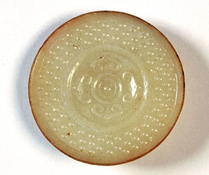 谷纹是农耕文明发展的产物,寄托着人们对丰收的渴望。战国柿蒂纹谷纹玻璃剑首,1953年出土于湖南长沙南门外东塘,现藏于湖南省博物馆。剑首呈圆饼状,米黄色,直径4.5厘米,厚0.5厘米。中心部位为两弦状圈纹围绕一枚谷粒纹,外饰单线勾勒的柿蒂纹,外圈有谷纹三周。柿蒂纹兴起于春秋战国、流行于汉代,因花纹形状像柿子分作四瓣的蒂而得名。柿子根固蒂厚,寓意坚固结实,一如坚韧强毅的农人,千百年来顺时而作,无论严寒酷暑。中国玻璃的起源可以追溯到西周时期,最初的玻璃制造受到西亚玻璃技术的影响,后逐步发展为独立制造。由于玻璃材质具有温润、半透明的特性,与玉器十分相似,古人会用玻璃制作仿玉礼器,这在玉矿资源相对不足的楚文化地区尤为常见。楚人好剑,有佩剑、赠剑、葬剑之俗,这件柿蒂纹谷纹玻璃剑首,对研究我国古代玻璃器源流和楚文化习俗都有重要意义。